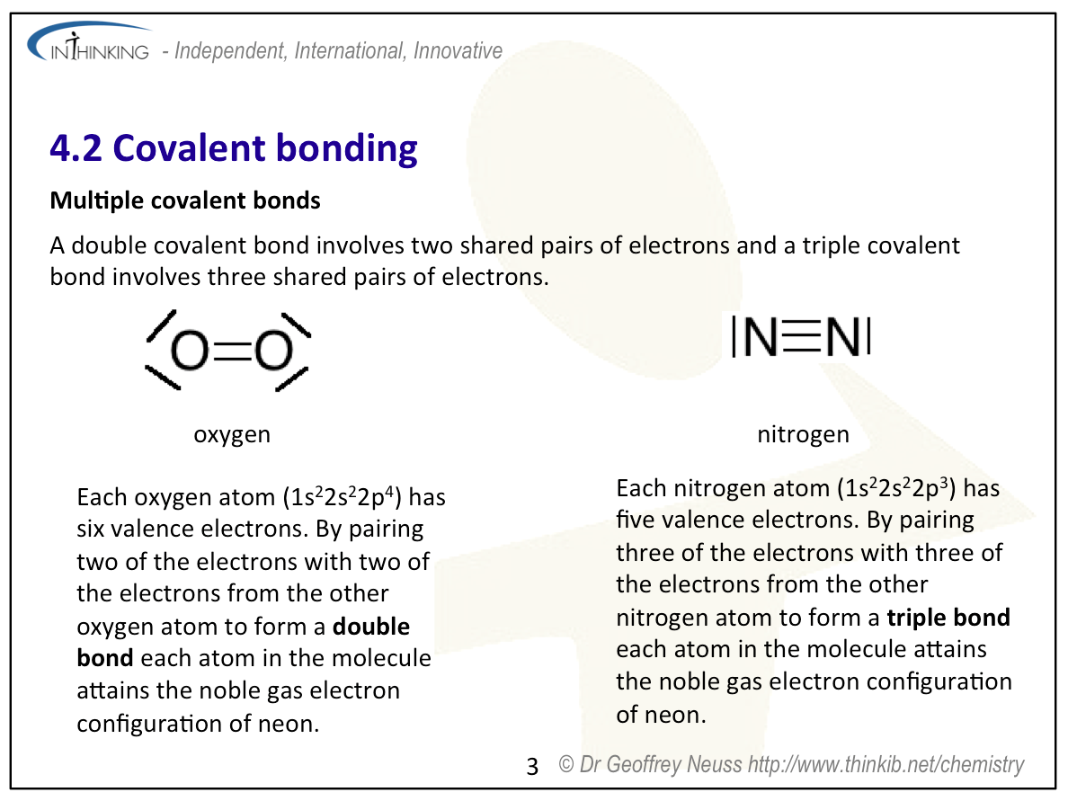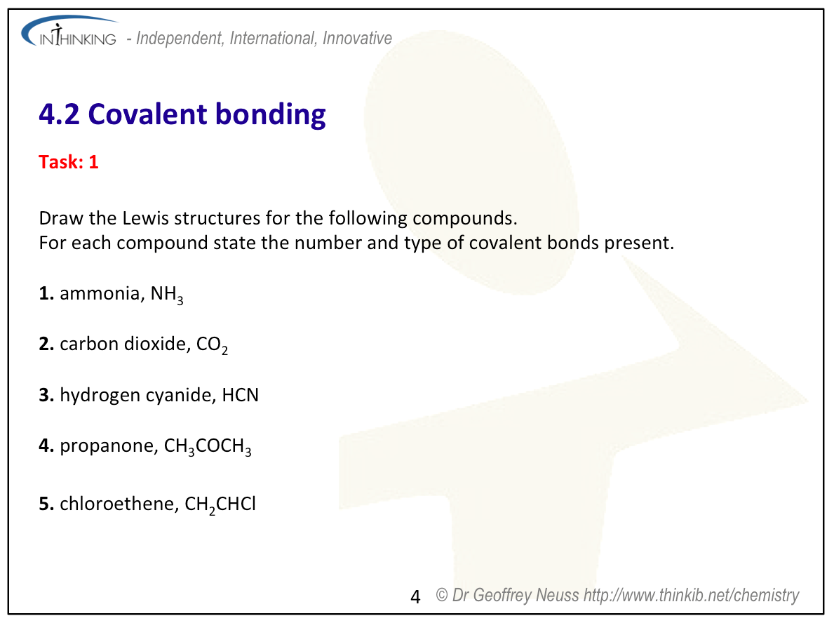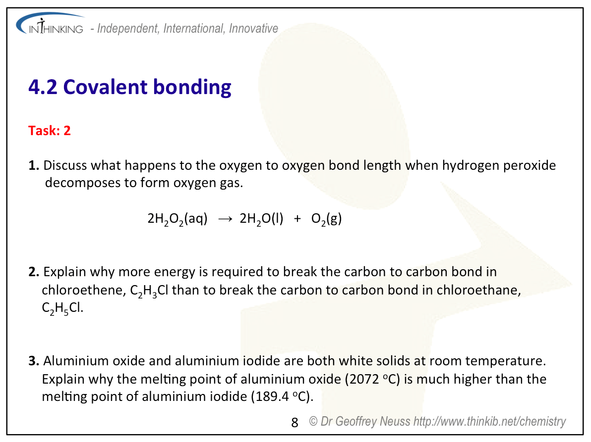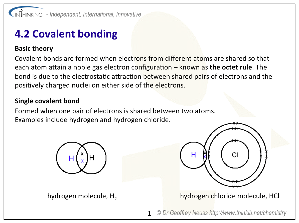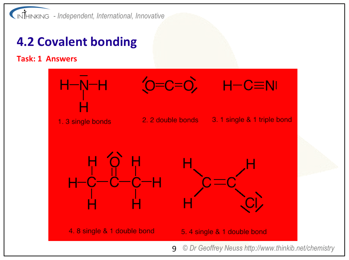 Page 26 QuestionsFor ten 'quiz' multiple choice questions with the answers explained see MC test: Covalent bonding. For short-answer questions which can be set as an assignment for a test, homework or given for self study together with model answers see Covalent bonding questions. Vocabulary listcovalent bond IM, TOK, 'Utilization' etc.See separate page which covers all of Topic 4 You can also use covalent bonding to illustrate the idea of a paradigm - see the page on A modern paradigm. Practical work