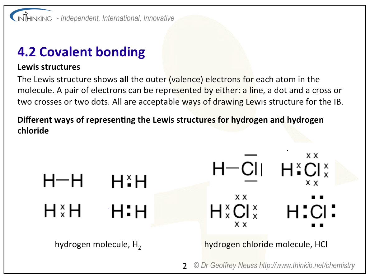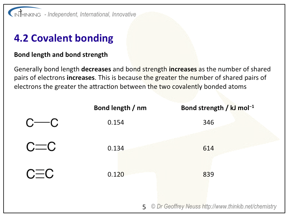 Teaching tipsThis is an important topic and one which students need to understand well as it leads on to covalent structures and shapes. The approach I take depends a little on the background of the students because Sub-topic 4.2 does not actually go much further than pre-Diploma level except perhaps for the concept of polarity and electronegativity values. It follows on naturally from ionic bonding and the obvious place to start is with hydrogen. I like to define a single covalent bond as the sharing of a pair of electrons, one from each atom. This holds true for fluorine and chlorine as well as hydrogen. Then I show how atoms can share more than one pair of electrons to produce double and triple bonds (e.g. O2, N2, C2H4 etc.). Stress that double and triple bonds are usually stronger and shorter than single bonds. This prepares students well for the next topic which involves coordinate bonds, the 'octet rule' and Lewis structures. When explaining electronegativity stress the difference between electron affinity (which is a physical quantity measured in kJ mol-1 relating to individual gaseous atoms) and electronegativity which is a relative value and refers to the unequal sharing of bonding electron pairs in a compound. Stress that bonds between two atoms of different elements will always be polar as the electron pair(s) will not be shared equally. However, whether a molecule is polar or not depends on the symmetry of the molecule as the resultant dipole may be zero. | Study guide