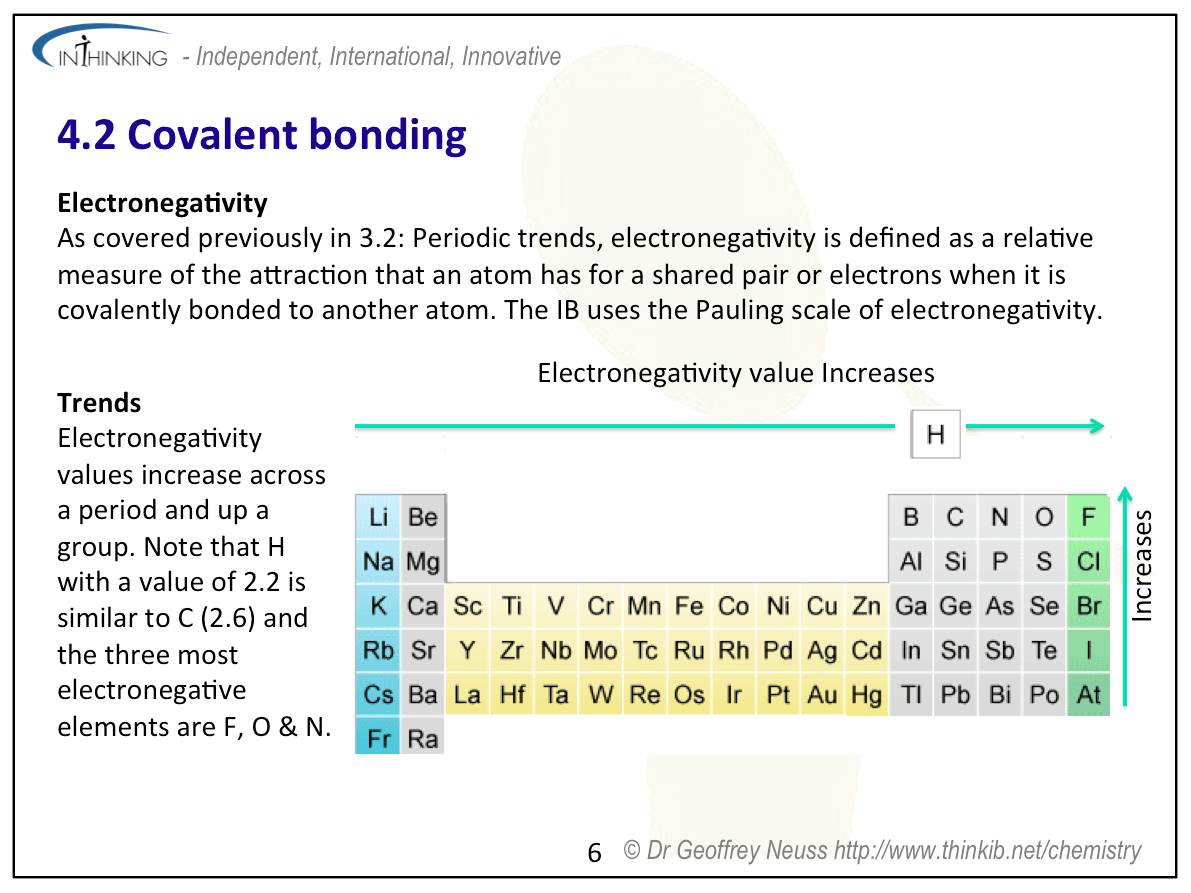 The IB uses Pauling’s scale of electronegativity. It was Linus Pauling who first proposed the idea that the bonding electrons pair between two different atoms is not shared equally. If the electrons are in the same outer electron energy level in both atoms then they will tend to be closer to the atom with the greater number of protons in the nucleus resulting in a polar bond. Similarly the closer the outer electron energy level is to the nucleus then the greater the electronegativity. Thus fluorine is the most electronegative element of all. Pauling’s scale was first proposed in 1932 and is a relative scale so has no units.