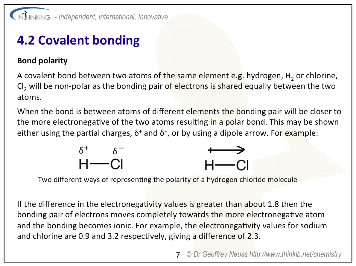 | Clarification notesPartial charges, dipoles or vectors can all be used to show bond polarity.Electronegativity values (according to Pauling) are given in Section 8 of the data booklet.