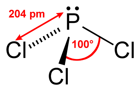 However this is yet another case of where the IB (and other pre-university courses) conveniently does not explore further as the logic appears flawed. Consider applying the same logic to phosphorus trichloride. Like ammonia there are three bonding pairs and only one non-bonding pair so one would expect the bond angle to be just less than 109.5o and more than 104.5o. In fact the bond angle is 100o. You might argue that it is the chlorine that perhaps makes the difference. So let's look at phosphine where the only difference with ammonia is that a phosphorus atom has replaced the nitrogen atom. The bond angle of 93.5o is even lower than phosphorus trichloride and considerably lower than the H-O-H bond angle in water where there are two non-bonding pairs.