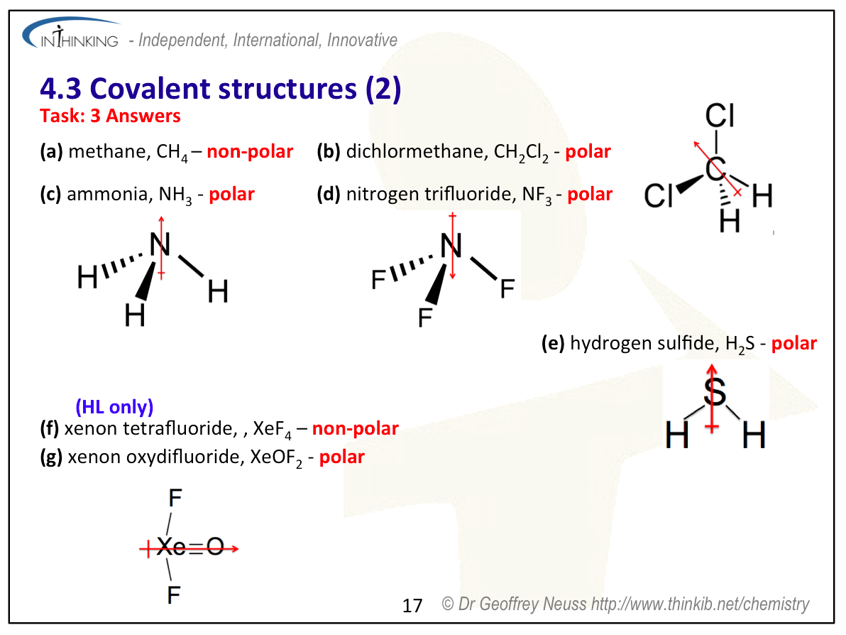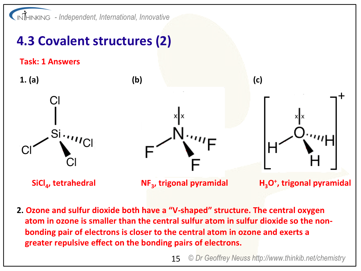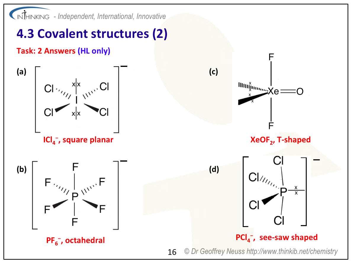 Page 27 QuestionsFor ten 'quiz' multiple choice questions with the answers explained see MC test: Covalent structures (2). For short-answer questions which can be set as an assignment for a test, homework or given for self study together with model answers see Shapes & polarity questions.Vocabulary listelectron domain IM, TOK, 'Utilization' etc.See separate page which covers all of Topic 4 & 14. Practical work