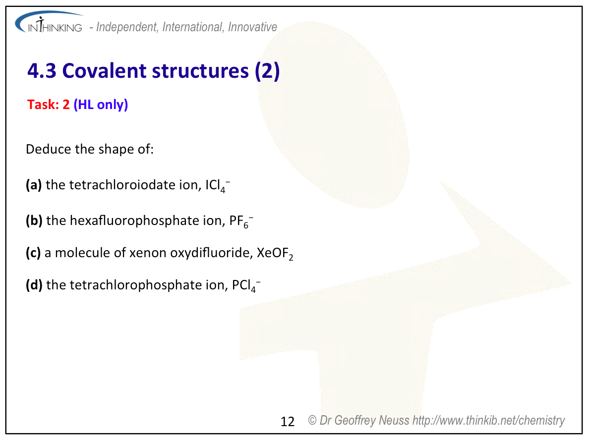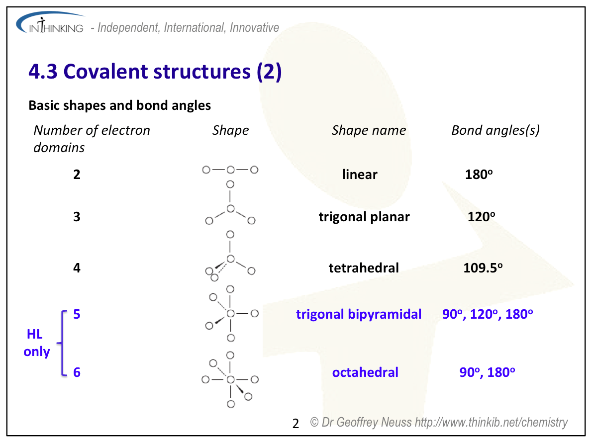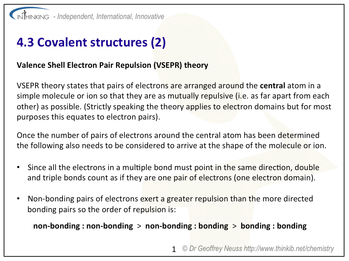 This is the second part of 4.3 Covalent structures and looks at VSEPR theory to determine the shapes of simple molecules and ions. Since the underlying theory is the same it also includes 5 and 6 electrons pairs around the central atom which is on the Higher Level programme under 14.1.