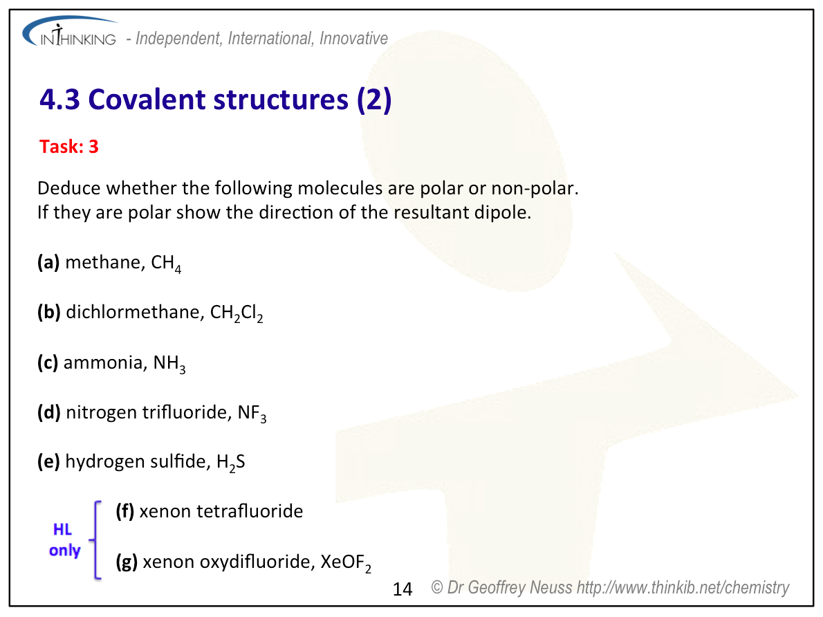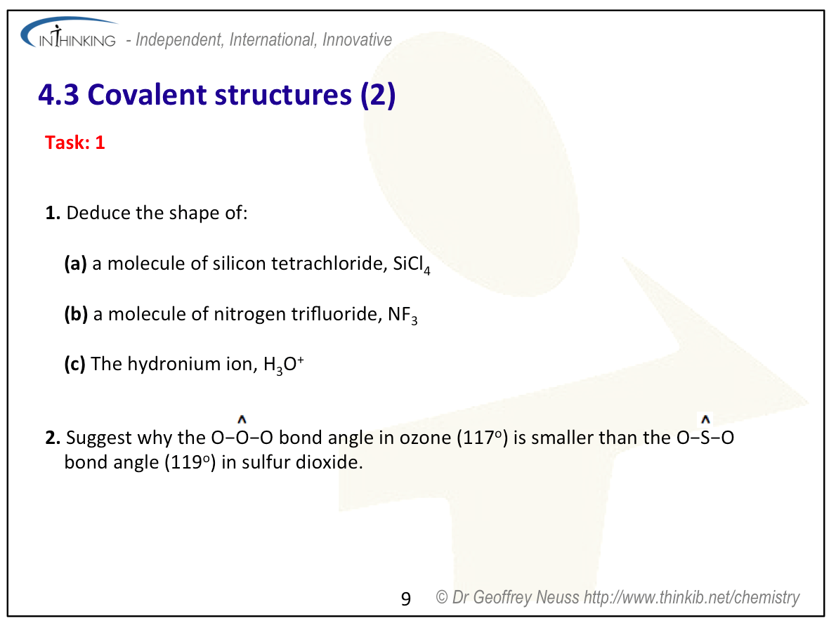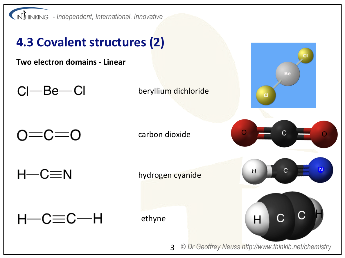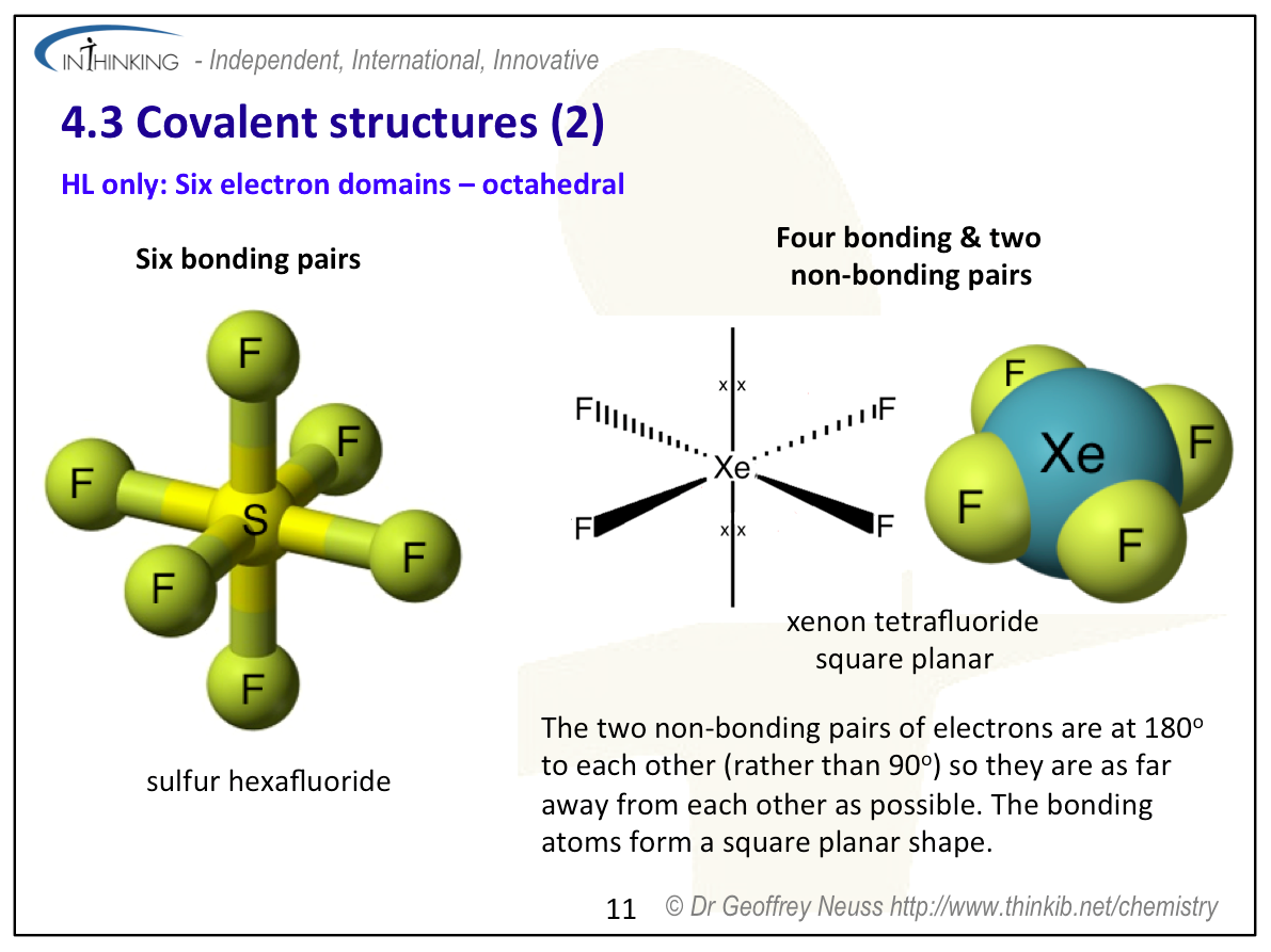 This is the second part of 4.3 Covalent structures and looks at VSEPR theory to determine the shapes of simple molecules and ions. Since the underlying theory is the same it also includes 5 and 6 electrons pairs around the central atom which is on the Higher Level programme under 14.1.