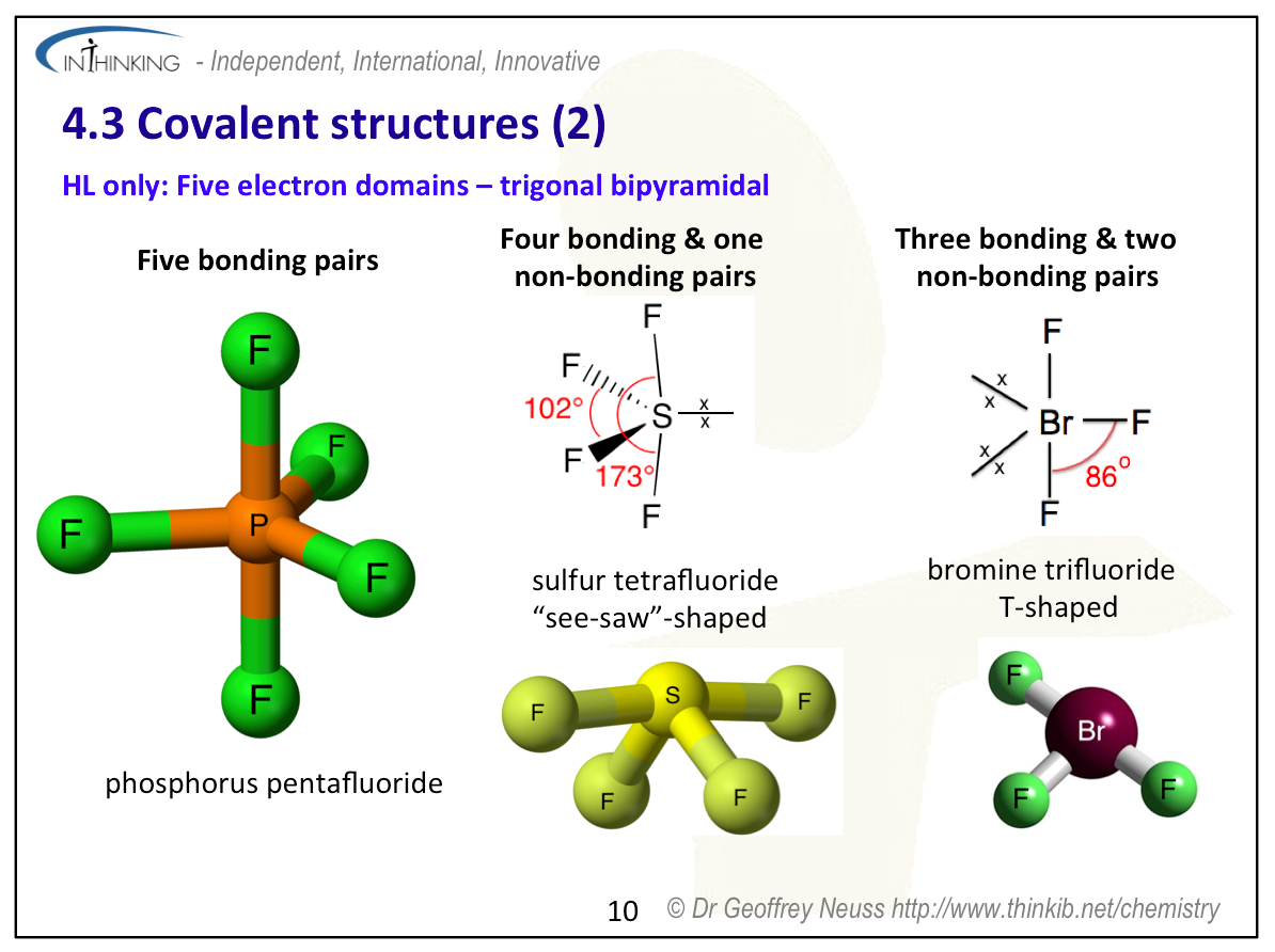 Throughout all of this get them to make actual three dimensional models of each shape that they can hold in their hands (rather than just see on a two-dimensional screen) and explain bond angles and how the 3-D shapes can be drawn (represented) in two-dimensions. Once the shapes are known molecular polarities are relatively straightforward. One problem you might encounter with five pairs is how to name the shape formed when there are four bonding pairs and one non-bonding pair. This is the case for sulfur tetrafluoride, SF4. I have variously seen K-shaped, distorted tetrahedral or see-saw. See-saw is the name given in Wikipedia. | Study guide