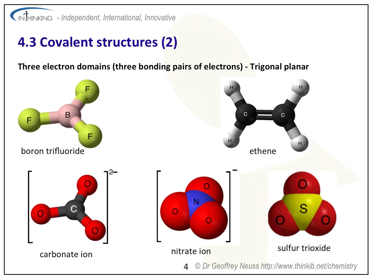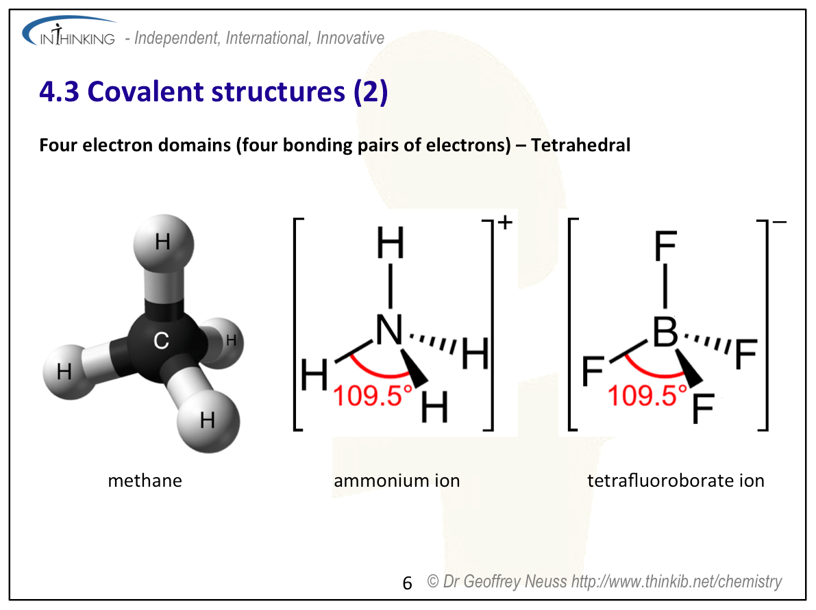 | Clarification notesThe term “electron domain” will be used in place of “negative charge centre”. Although not specifically listed on the programme suitable examples might include CH4, NH3, H2O, NH4+, H3O+, BF3, C2H4, SO2, C2H2 and CO2.