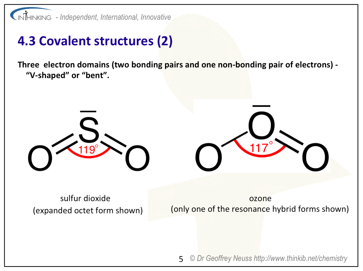 Teaching tipsYou can get students to arrive at shapes by considering the hybridization of the central atom. However as hybridization is not on the syllabus for Standard Level and as d2sp3 hybridization is not on the syllabus for Higher Level it is best not to go down this path except perhaps for carbon compounds with Higher Level students. In fact VSEPR theory is very simple to explain (even though students seem to find it difficult - see Paper 2: Areas of difficulty VSEPR). Electron pairs (domains) try to arrange themselves so that they are as far away from each other as possible. This leads to the basic shapes for 2,3,4,5 and 6 pairs. To find the actual shape there are really only three points to consider: I then work through the possibilities with some of the classic examples: Then explain why the H-O-H bond angle for H2O is smaller than H-N-H bond angle in NH3 which in turn is smaller than H-C-H bond angle in CH4