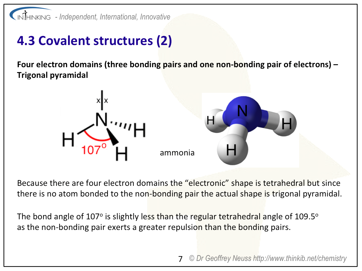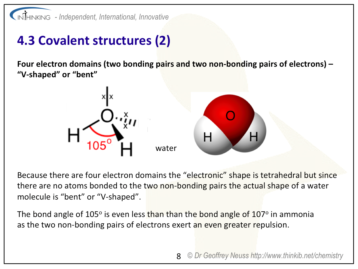 Part of sub-topic 4.3 is to predict the bond angles in species with two, three and four electrons domains. The classic example used for both Standard and Higher Level students is to compare the bond angles in methane, ammonia and water. It all seems highly logical. In methane all the four pairs of electrons (electron domains) are bonding pairs so repel each other equally to give a regular tetrahedron with bond angles of 109.5o. Ammonia contains one non-bonding pair which repels bonding pairs more than other bonding pairs so the bond angle decreases to about 108o in the trigonal pyramid molecule. The two non-bonding pairs in water cause even more repulsion so the bond angle in the bent molecule decreases further to about 104.5o. This can be found in all the text books and the theory perfectly matches the experimentally found bond angles.