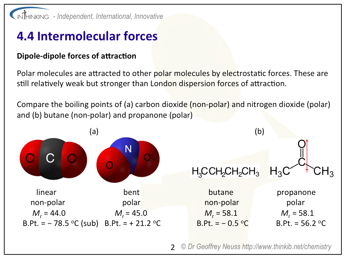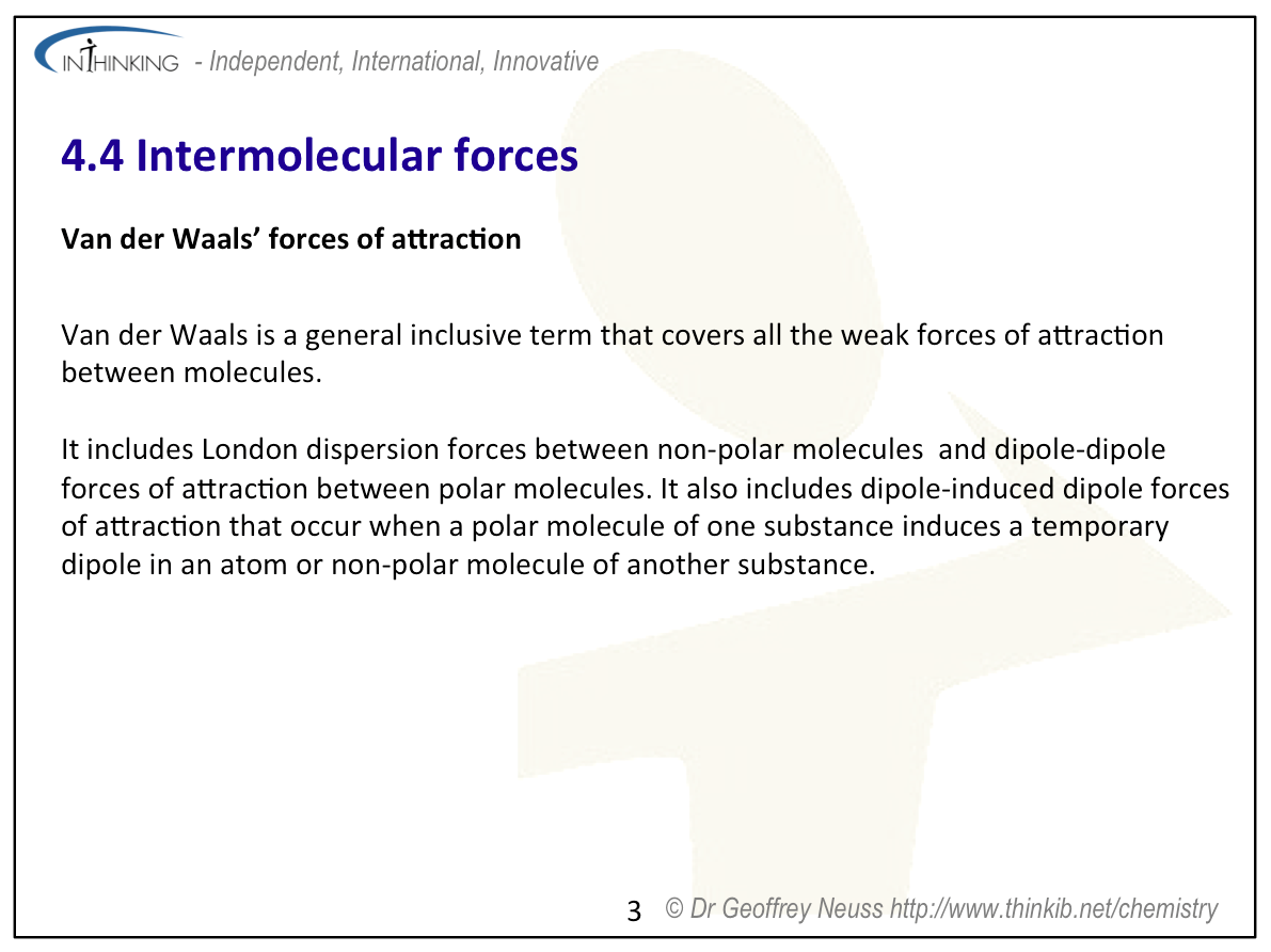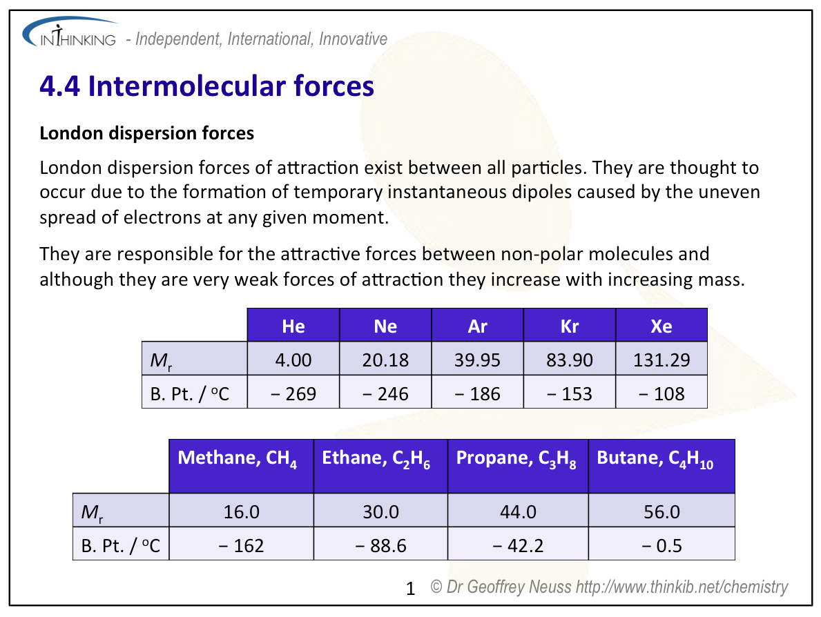 | Clarification notes“London (dispersion) forces” should be used to describe the instantaneous induced dipole - induced dipole forces that exist between any atoms or groups of atoms and should be used for non-polar entities. International-mindedness(Nothing is listed in the programme for international-mindedness under this sub-topic) |
