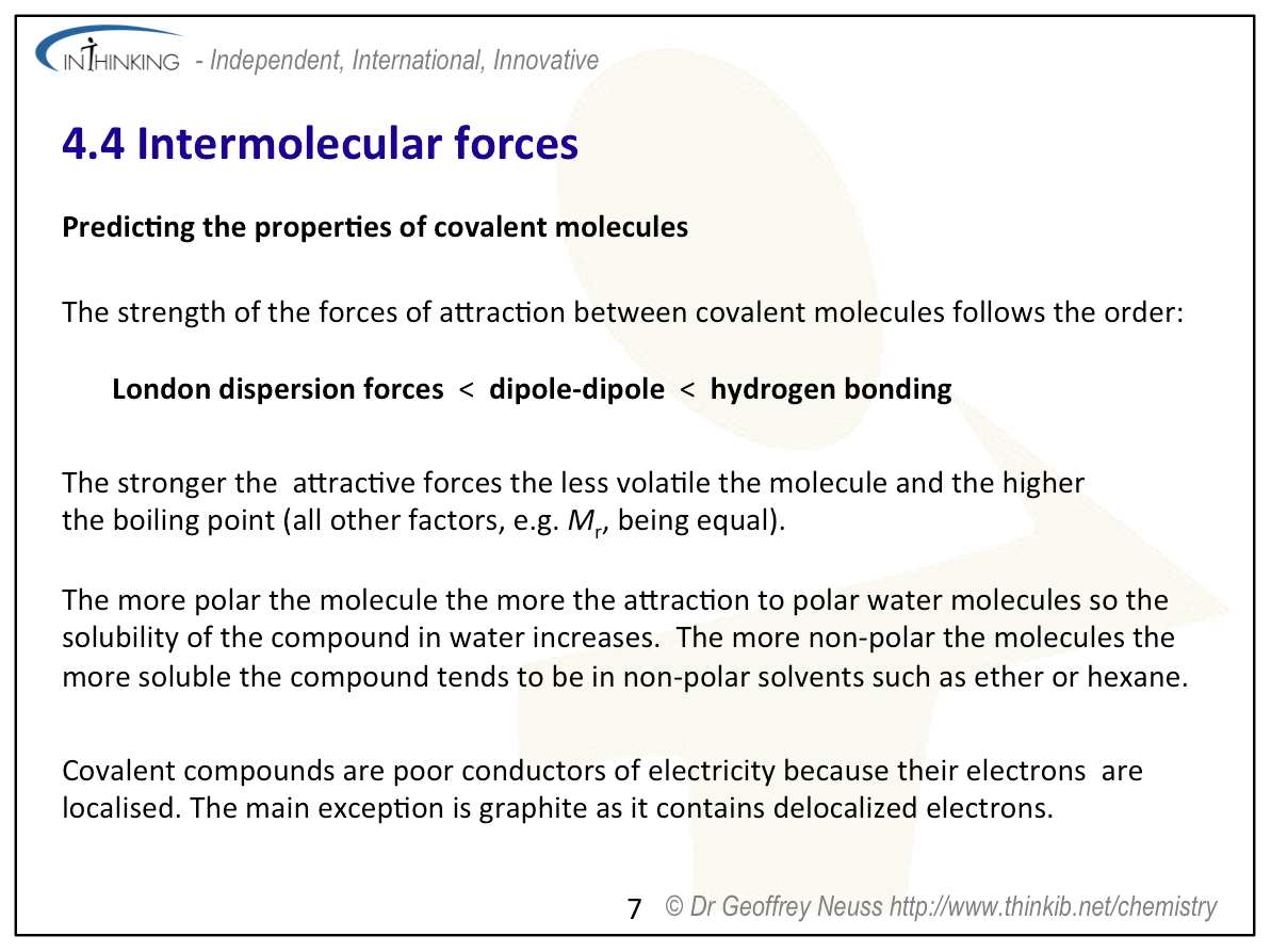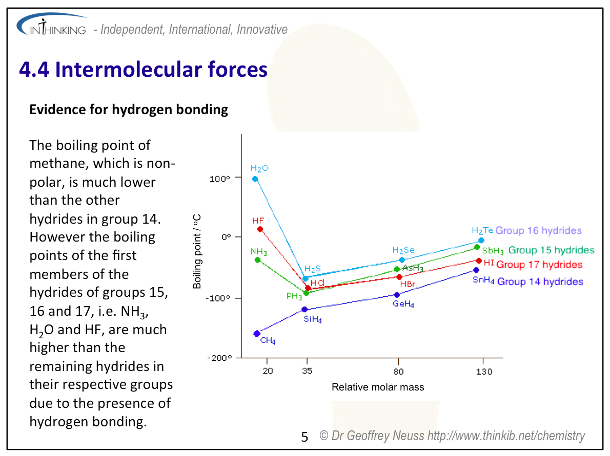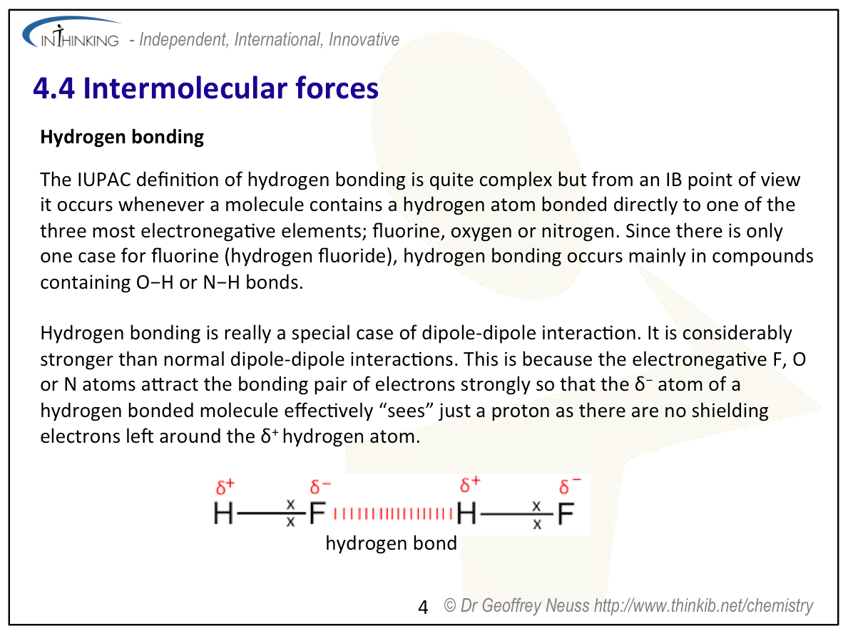 | Clarification notes“London (dispersion) forces” should be used to describe the instantaneous induced dipole - induced dipole forces that exist between any atoms or groups of atoms and should be used for non-polar entities. International-mindedness(Nothing is listed in the programme for international-mindedness under this sub-topic) |