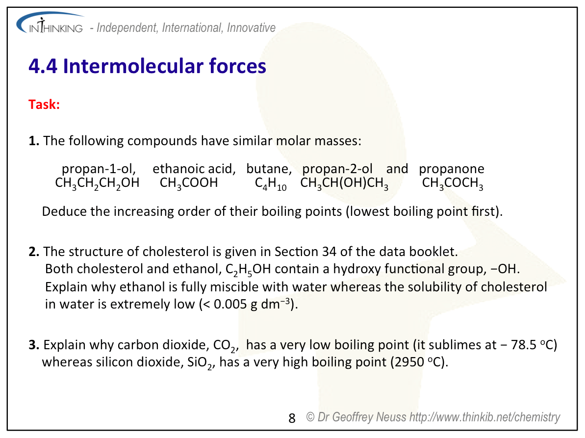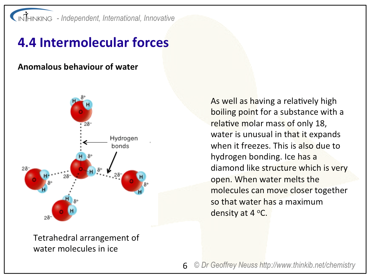 Teaching tipsAlthough this topic may seem quite straightforward to us as teachers it is something that many students experience considerable difficulty with as evidenced by how they answer questions on intermolecular forces in exams. For this reason it needs to be taught thoroughly and carefully. I start by looking at how we can gauge the strengths of the attractive forces and talk about what happens during changes of state. Melting points are not reliable as they depend on the packing in the solid and the particles are still close together in the liquid state so emphasise the importance of boiling points. The practical on boiling points of mixtures is superb and well worth doing. Propan-1-ol and propan-2-ol both have hydrogen bonding, ethanol and cyclohexane show hydrogen bonding and London (dispersion) forces of attraction respectively and trichloromethane and ethyl ethanoate show dipole-dipole individually and hydrogen bonding when mixed. As well as using water/ice and ammonia etc. to illustrate hydrogen bonding I also use HF and HCl, H2O and H2S, NH3 and PH3, CH3OCH3 and CH3CH2OH and propane, ethanal and ethanol. I also give a very simple account of hydrogen bonding between the bases in DNA as it helps those doing biology. After covering all the different types of forces challenge them to put a list of compounds in increasing order of their boiling points. You need compounds with similar molar masses. A suitable list might be propan-1-ol (Mr = 60), propan-2-ol (Mr = 60), propanone (Mr = 58), butane (Mr = 58), 2-methypropane (Mr = 58), ethanoic acid (Mr = 60), methoxyethane (Mr = 60) and methyl methanoate (Mr = 60). You can even chuck in sodium chloride (Mr = 58.5) extra! If students can deduce the correct order for all these compounds then they will have gained an excellent understanding. Finally one word of warning. Be careful if you use past IB questions because the answers may no longer be 'correct'. In the past an answer that was "van der Waals' forces" may now be "London (dispersion) forces". | Study guide