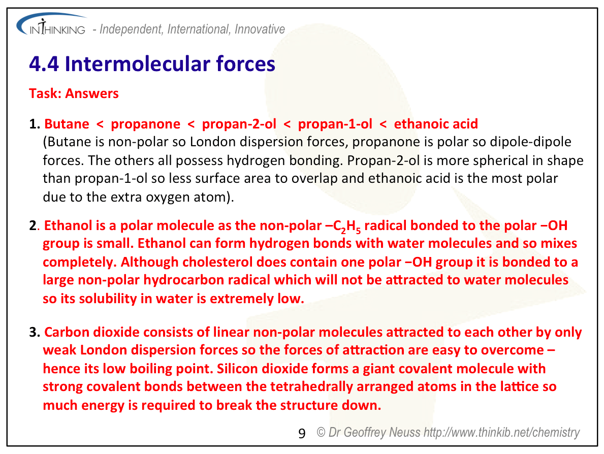 Pages 29 & 30 QuestionsFor ten 'quiz' multiple choice questions with the answers explained see MC test: Intermolecular forces. For short-answer questions which can be set as an assignment for a test, homework or given for self study together with model answers see Intermolecular forces questions. Vocabulary listLondon (dispersion) forces IM, TOK, 'Utilization' etc.See separate page which covers all of Topic 4. Practical work