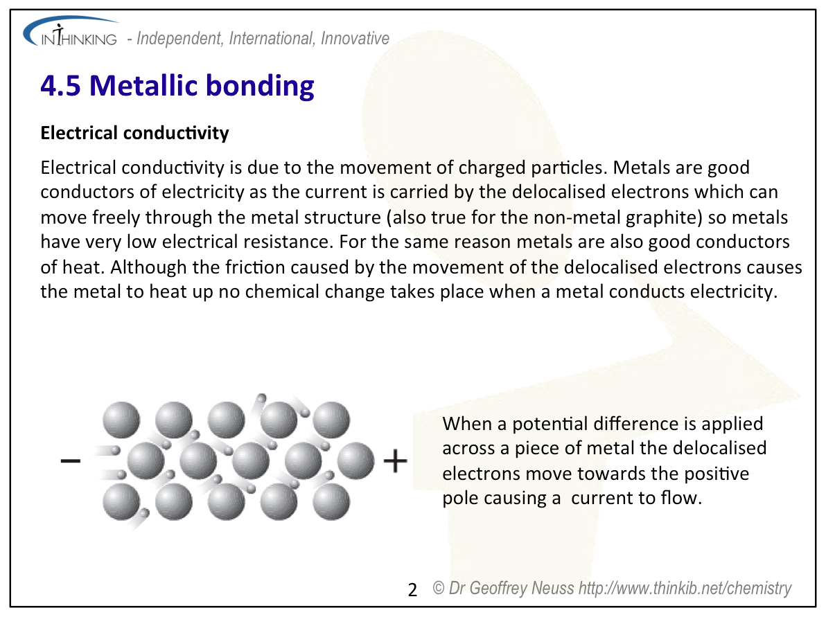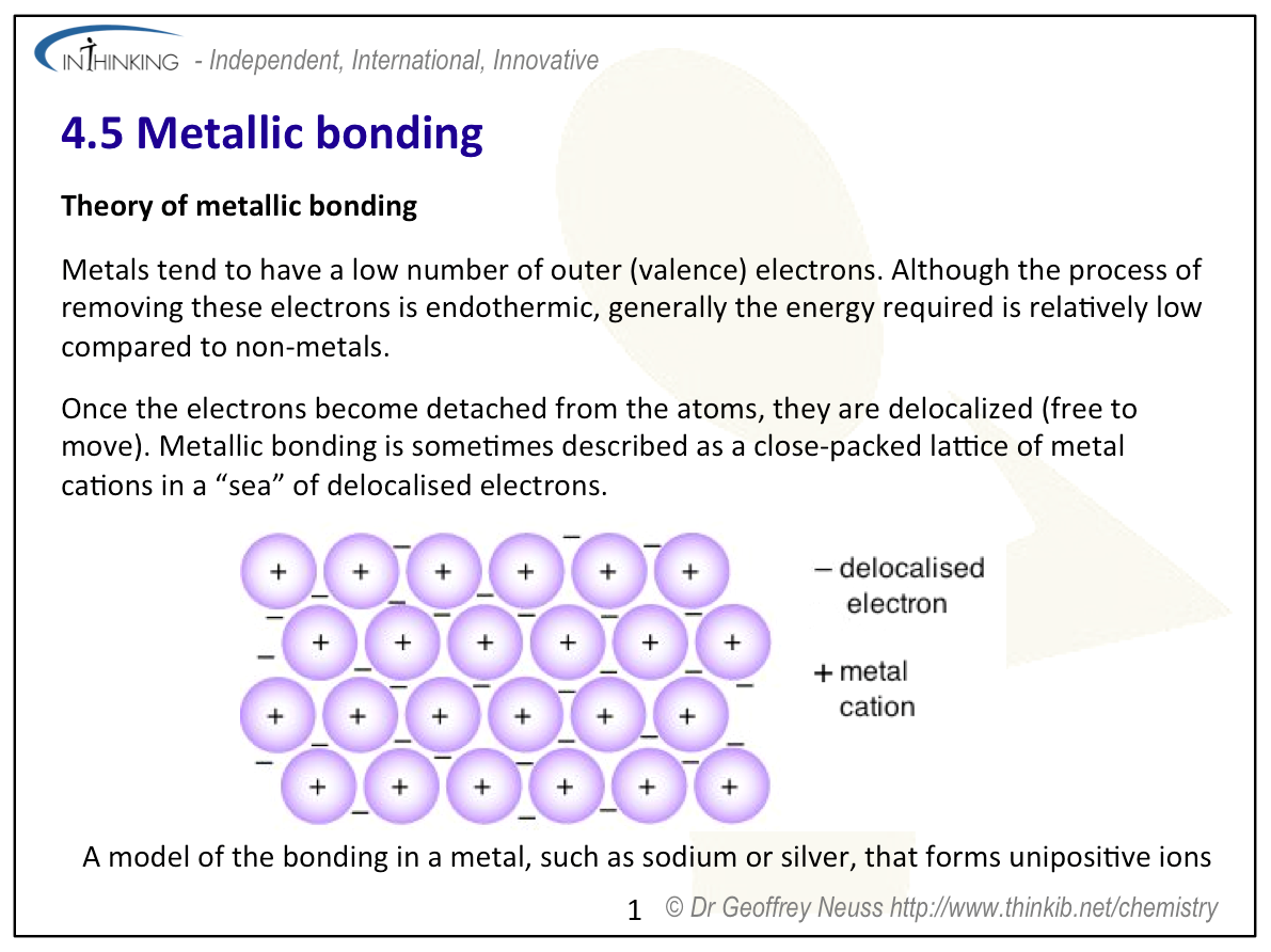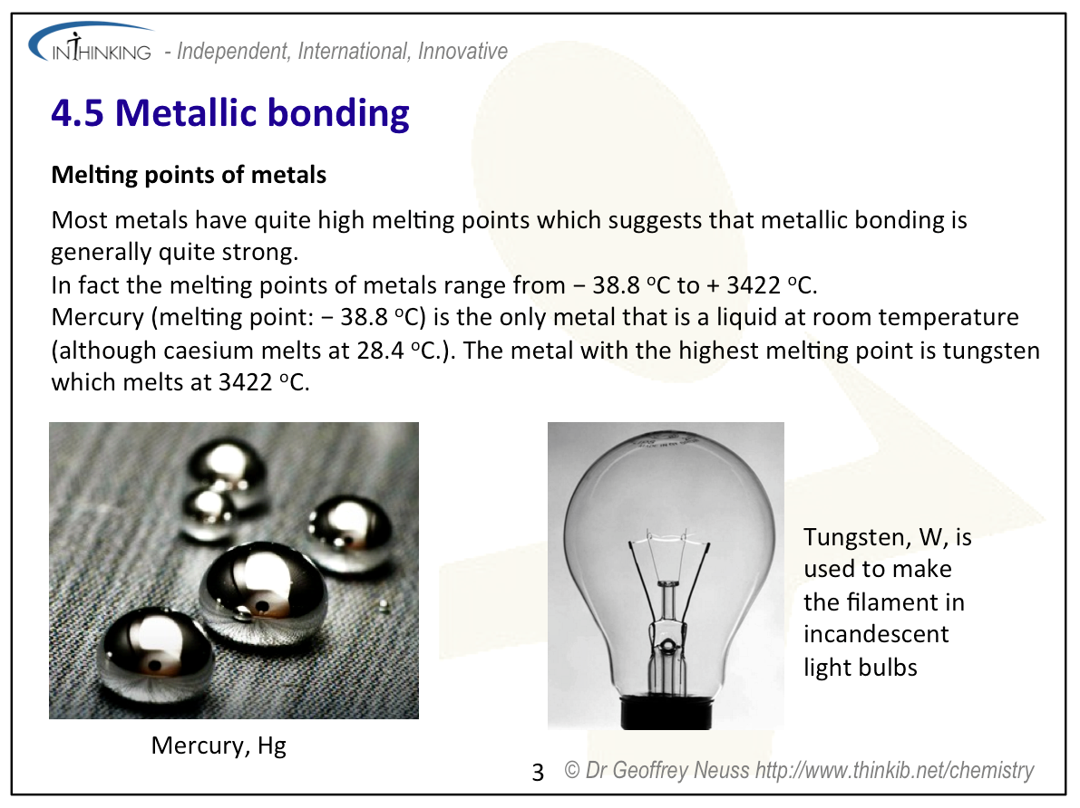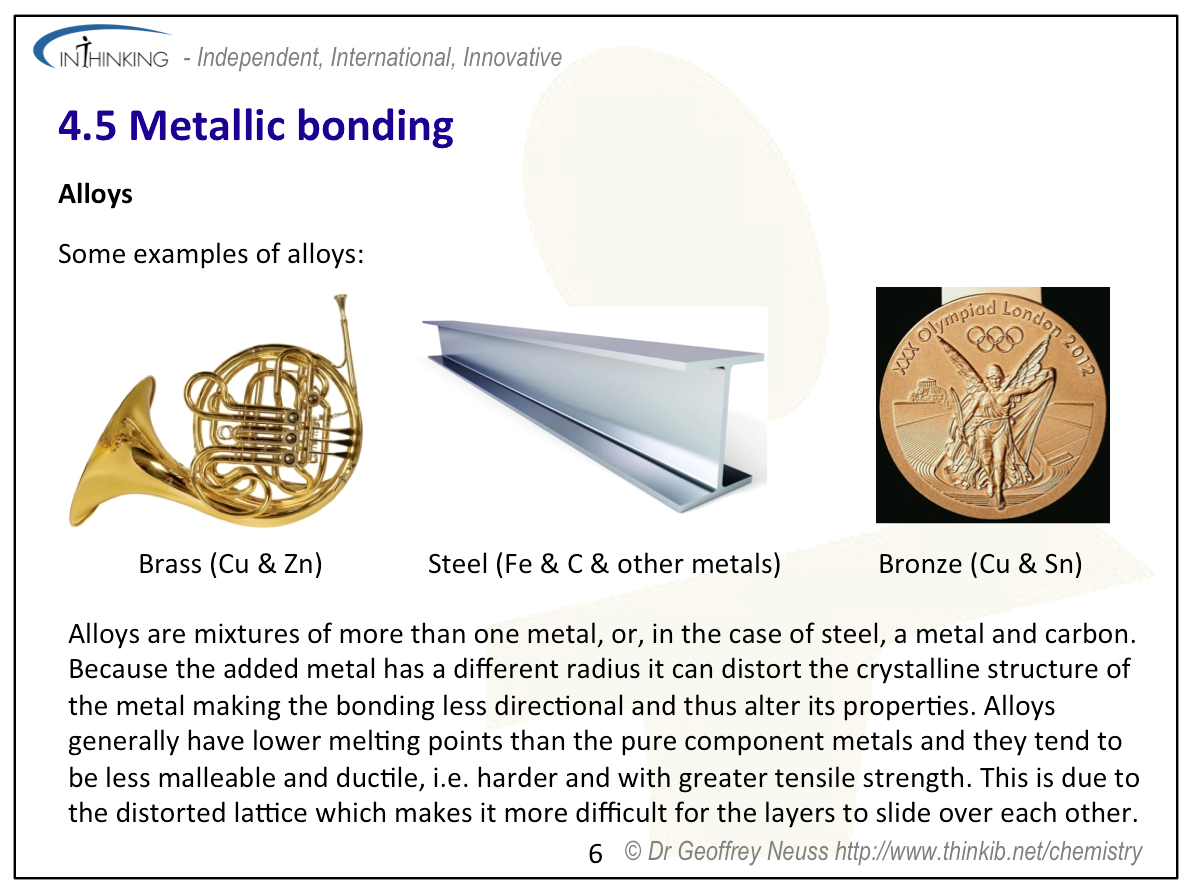 Teaching tipsMetallic bonding is treated very simply by the IB. All students really need to know is that the outer electrons become delocalized so that a metal essentially consists of an array of positive ions (cations) within a 'sea' of delocalized electrons. Because the electrons are free to move metals are good electrical conductors. Since the electrons are mobile they are also good conductors of kinetic energy in the form of heat. Generally the smaller and more highly charged the cation then the greater the attraction to the electrons and the higher the melting point although it does also depend upon the way in which the metal atoms are packed. This trend holds true for descending group 1 (the alkali metals) but it is worth pointing out to your students that it is not true within group 14 as tin (m.pt 232 oC) has a lower melting point than lead (m.pt 328 oC) even though it has a smaller ionic radius. Similarly magnesium has a lower melting point than the other metals in group 2 which do then follow the trend. Examples of alloys you should probably cover include steel (including stainless steel), bronze, brass, amalgams and maybe also solder and pewter. Because the added metals are likely to have a different radius and may also have a different charge they distort the structure of the original metal as the bonding is less directional. Because of this alloys may have lower melting points than their component metals. | Study guide