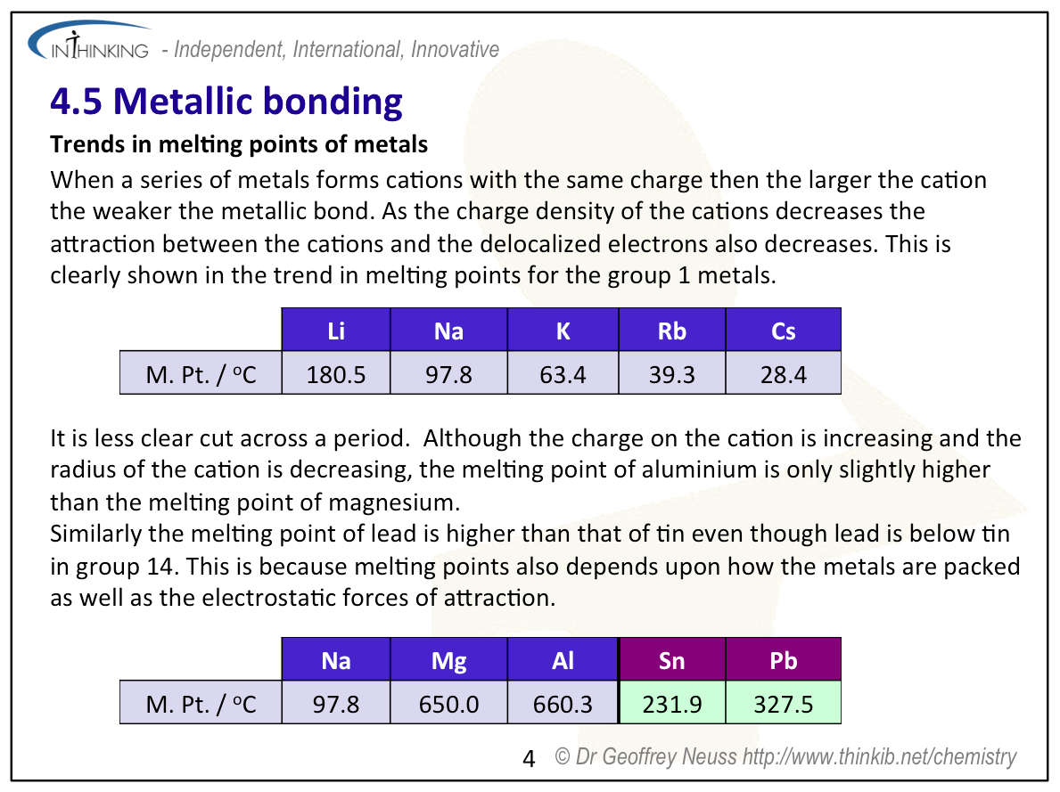 Sub-topic 4.5 is very straightforward and it clearly states the trends should be limited to s and p block metals. As I point out in the teaching tips below there is a problem with the p block metal trends in group 14 as although tin has a smaller atomic radius than lead (1.40 x 10-10 m compared to 1.45 x 10-10 m according to the IB data booklet) it has a lower melting point (232 oC compared to 328 oC).
