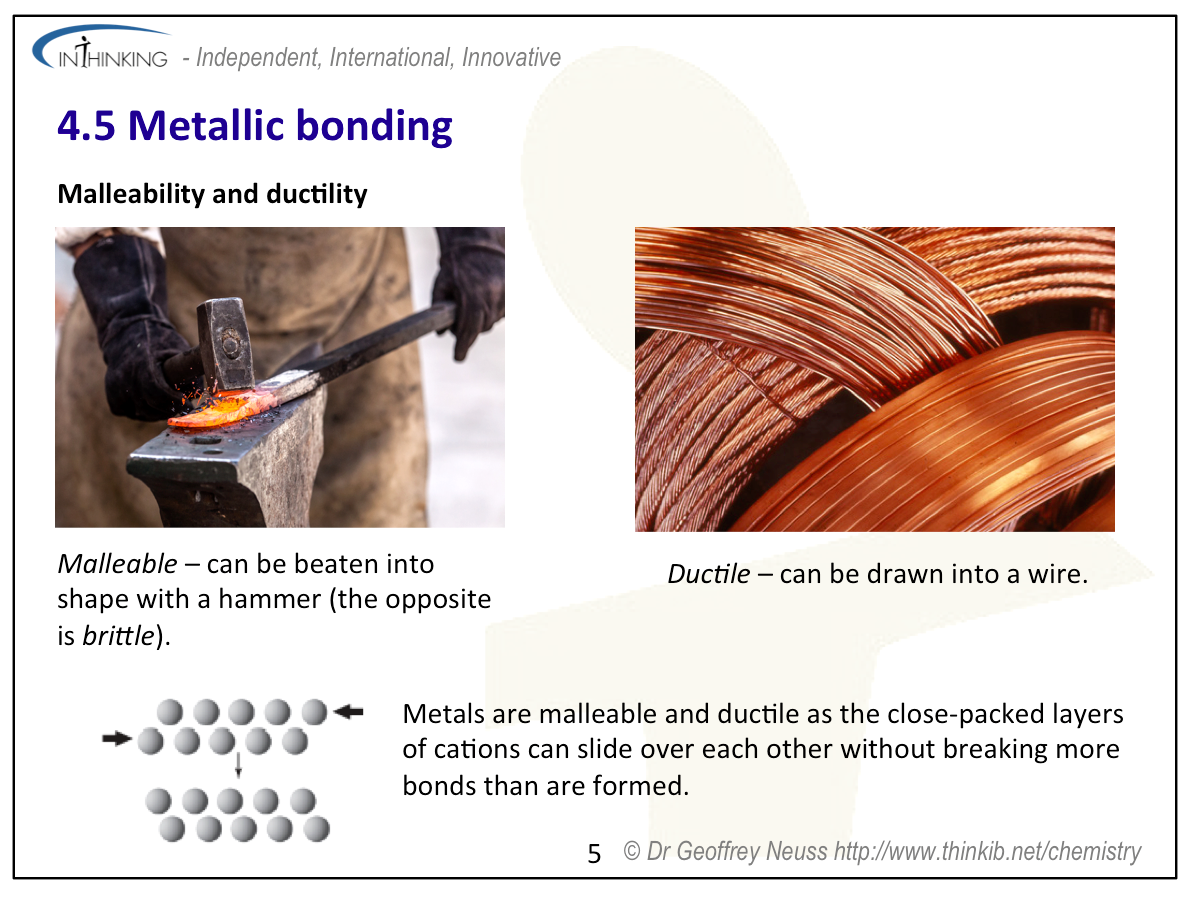 2. A fairly simplified video from two teachers, Jonathan Bergman and Aaron Sams which covers the basics of metallic bonding and why they conduct heat and electricity and are malleable.