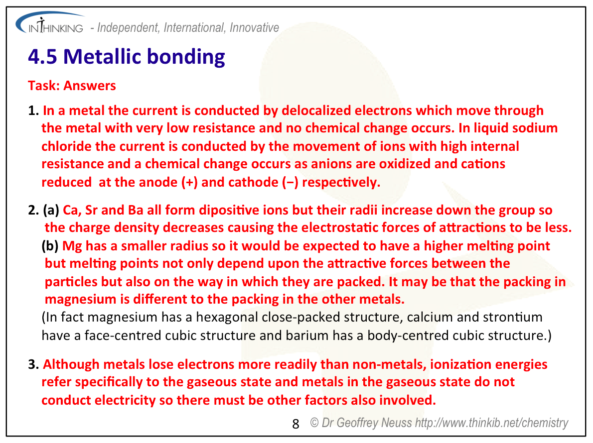 Pages 30 & 31 QuestionsFor ten 'quiz' multiple choice questions with the answers explained see MC test: Metallic bonding. For short-answer questions which can be set as an assignment for a test, homework or given for self study together with model answers see Metallic bonding questions. Vocabulary listalloy IM, TOK, 'Utilization' etc.See separate page which covers all of Topic 4 |
