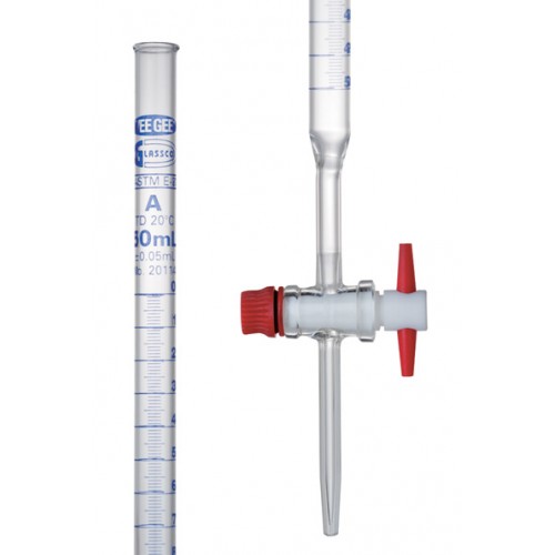 It is not quite so obvious when certain instruments are used even though technically two readings are taken. Consider measuring the mass of something using a balance accurate to ± 0.001 g. If the balance is reading zero and say an empty weighing bottle is placed on the balance then the mass of the weighing bottle might be recorded as 20.034 ± 0.001 g. If about ten grams of magnesium are placed in the weighing bottle and the new mass is 30.456 g then it would be usual to record the accurate mass of the magnesium as 10.422 ± 0.002 g. But is this really correct? When the balance was reading zero it is actually accurate to ± 0.001 g i.e. zero is a mass between - 0.001 and + 0.001 g so the mass of the weighing bottle should really be recorded as 20.034 ± 0.002 g and the mass of the magnesium, which is now the result of three separate readings, 10.422 ± 0.003 g. A sensible person will question whether this sort of pedantic attention to detail is really necessary. It isn't, but because of teacher's insecurity with how their IA marks are moderated it has almost become so. In fact instruments that rely on two readings for any measurement e.g. a balance or a burette state on them their uncertainty. A burette for example might say 50 cm3 accurate to 0.05 cm3 (see image on left - although it gives the units as ml rather than cm3). What many people take this to mean is that the uncertainty for the actual volume measured can be taken as ± 0.05 cm3 even though it has been arrived at by taking the difference between the final and initial readings so arguably should actually be quoted as ± 0.10 cm3. Luckily the IA moderators are told to accept either the actual uncertainty stated on the instrument (or the estimated uncertainty if no value is given) or double the uncertainty when moderating student's internal assessment work if the student reports it in their Individual Scientific Investigation.