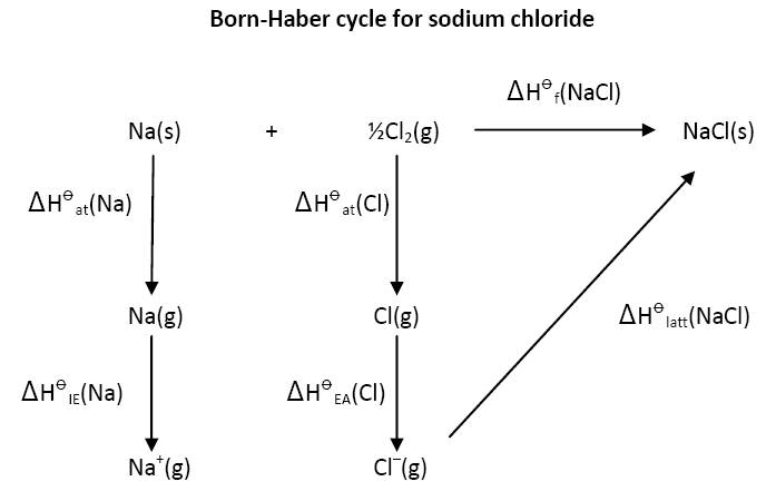 A Born-Haber cycle should be exactly that - a cycle. Many text books and websites actually give it as an enthalpy level diagram. If we take sodium chloride as the classic example then the basic reaction is the reaction of one mole of solid sodium metal with half a mole of chlorine gas to give one mole of solid sodium chloride. This can either proceed directly or via the gaseous atoms and ions as shown below: