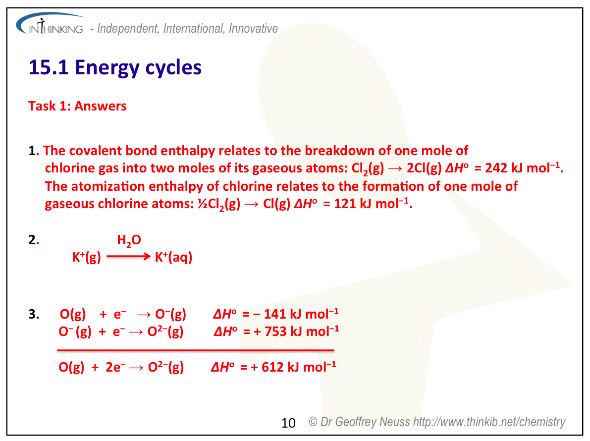 Page 42 QuestionsFor ten 'quiz' multiple choice questions with the answers explained see MC test: Energy cycles. For short-answer questions which can be set as an assignment for a test, homework or given for self study together with model answers see Energy cycles questions. Vocabulary listBorn-Haber cycle