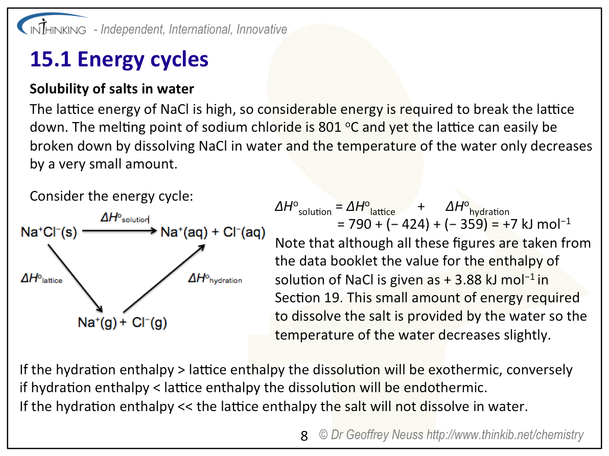 The idea of using an energy cycle to solve problems involving Hess's Law has already been introduced in sub-topic 5.2 Hess's Law. This Higher Level sub-topic involves the use of energy cycles that contain the lattice enthalpy and or enthalpies of hydration and solution. A Born-Haber cycle is simply a special case of Hess’s Law. It refers to the enthalpy change of formation of an ionic compound. It can either proceed directly or in a series of separate steps which involve several different enthalpies changes which assume that the salt formed is 100% ionic. Most of these enthalpy changes can be measured experimentally so the purpose of the Born-Haber cycle is either to find an unknown enthalpy value or to compare the experimental or theoretical value with that determined by the cycle. For the IB this usually means determining the value for the lattice enthalpy. If there is good agreement between the experimental and theoretical lattice enthalpy which has been calculated assuming a purely ionic structure then it is reasonable to assume the compound is close to being 100% ionic. However if the two values do not agree then it suggests that the salt contains some degree of covalent character. There were problems with this on the last programme as the theoretical values in the then data booklet had already taken into account any covalent character. The current data booklet for first exams in 2016 does not contain the theoretical values and in the guidance notes it states that the polarising effect of some ions which produces covalent character in some essentially ionic substances will not be assessed.
