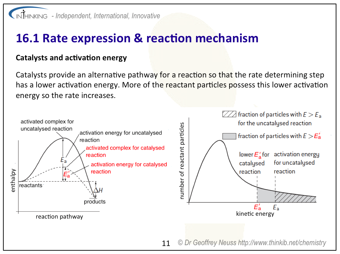 | Clarification notesCalculations will only involve orders with whole number values. International-mindednessThe first industrial catalyst to be used was for the Contact process to produce sulfuric acid. It has been stated that for a long time the amount of sulfuric acid produced by a country closely mirrored the country’s economic health. |