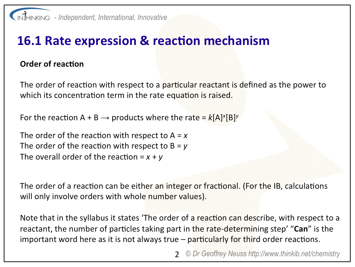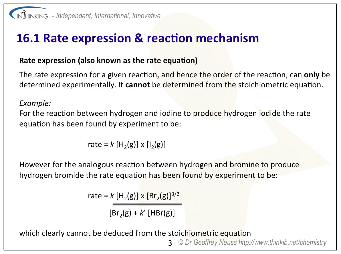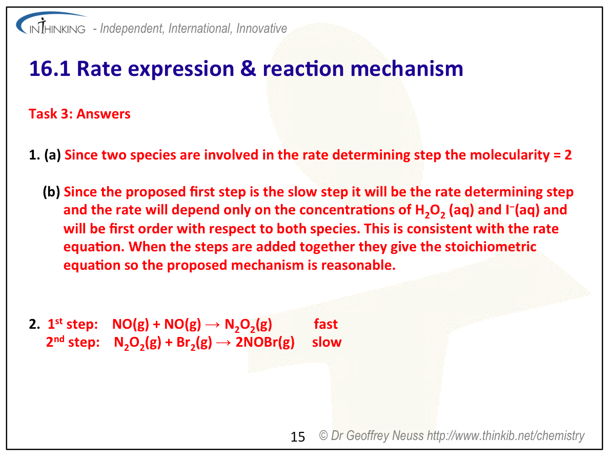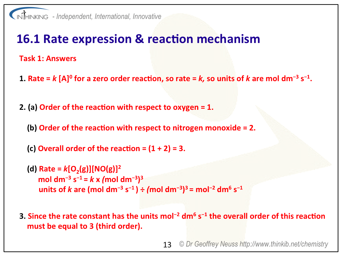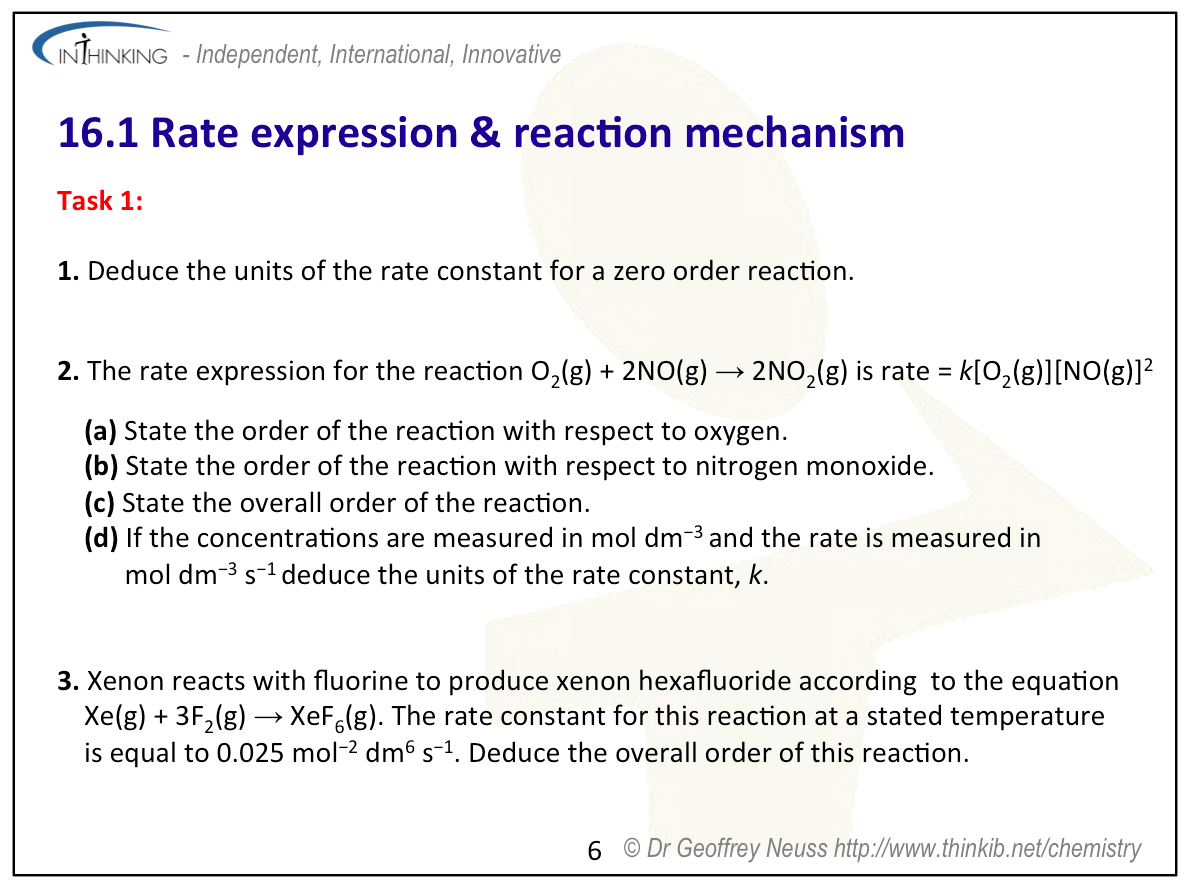 Page 49 - 50 QuestionsFor ten 'quiz' multiple choice questions with the answers explained see MCTest: Rate expression & reaction mechanisms. For short-answer questions on rate expressions which can be set as an assignment for a test, homework or given for self study together with model answers see Rate expression questions. For short-answer questions on reaction mechanisms which can be set as an assignment for a test, homework or given for self study together with model answers see Reaction mechanisms questions. Vocabulary listrate constant, k IM, TOK, 'Utilization' etc.See separate page which covers all of Topics 6 & 16 Practical work |