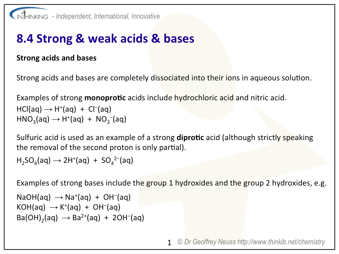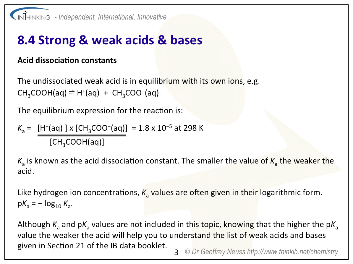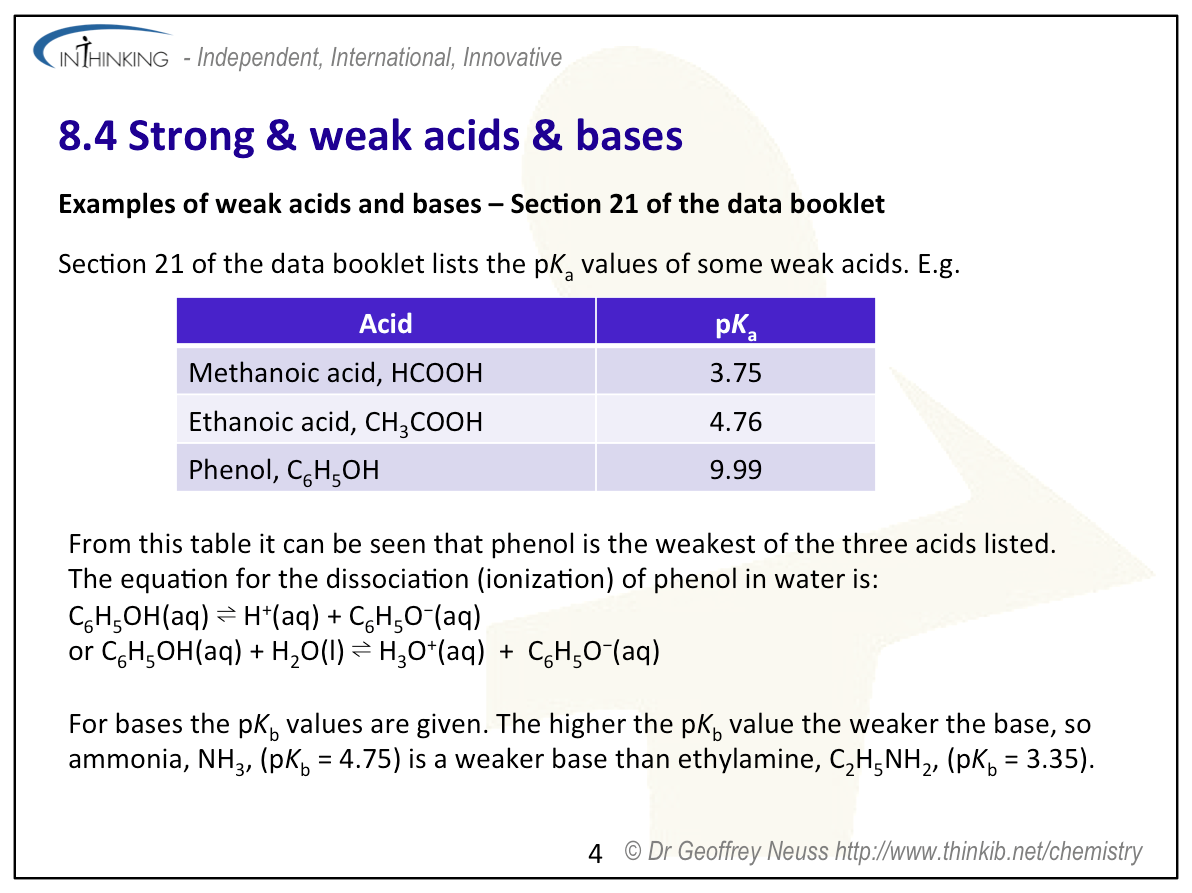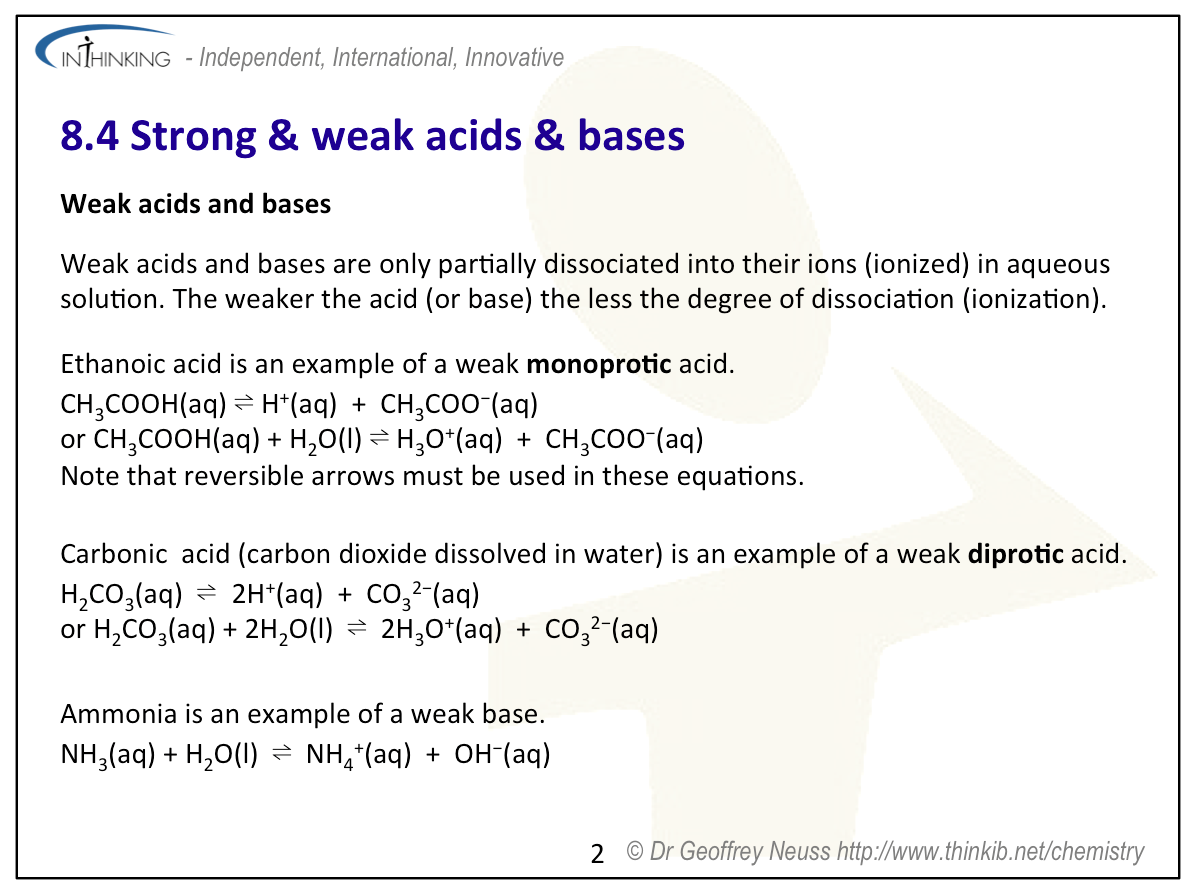 | Clarification notesThe terms dissociation and ionization are interchangeable. A list of weak acids and bases can be found in Section 21 of the data booklet. International-mindednessNothing is listed on the syllabus under this heading. |