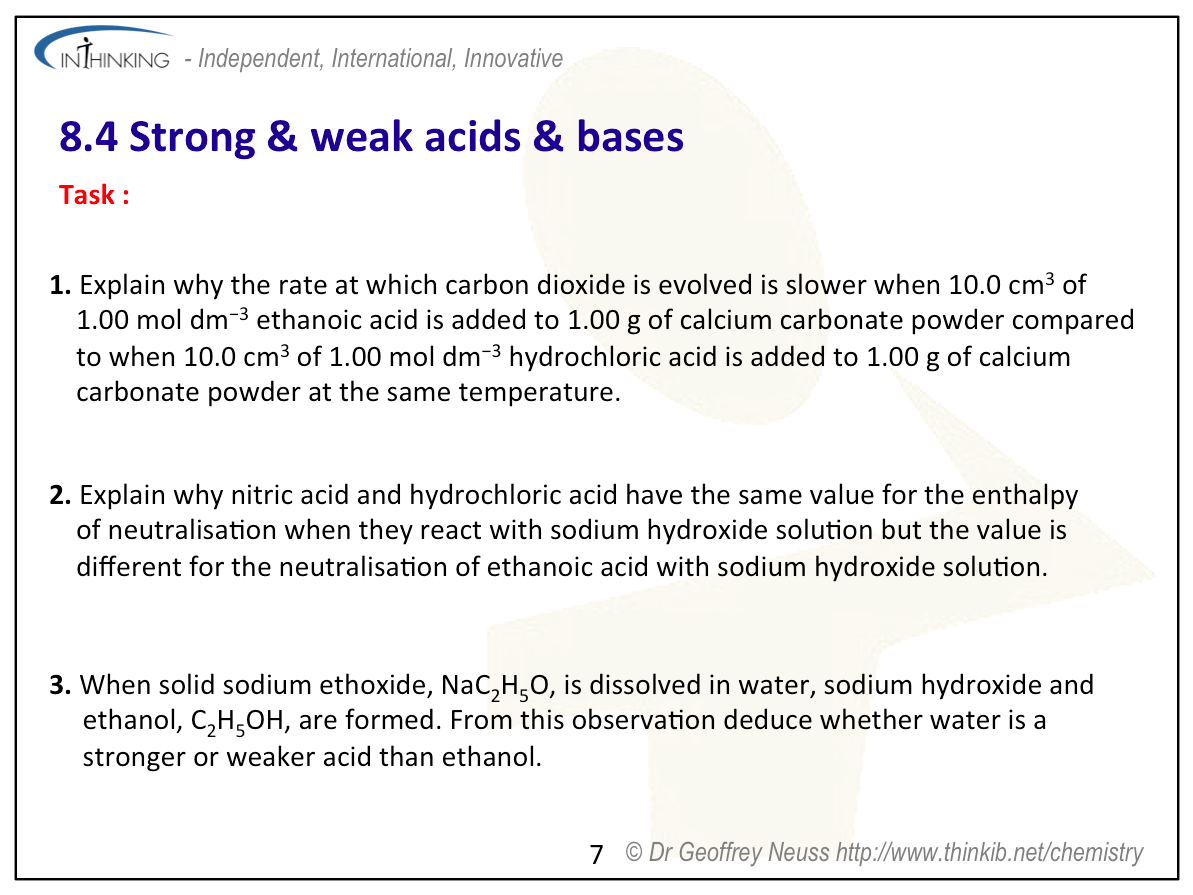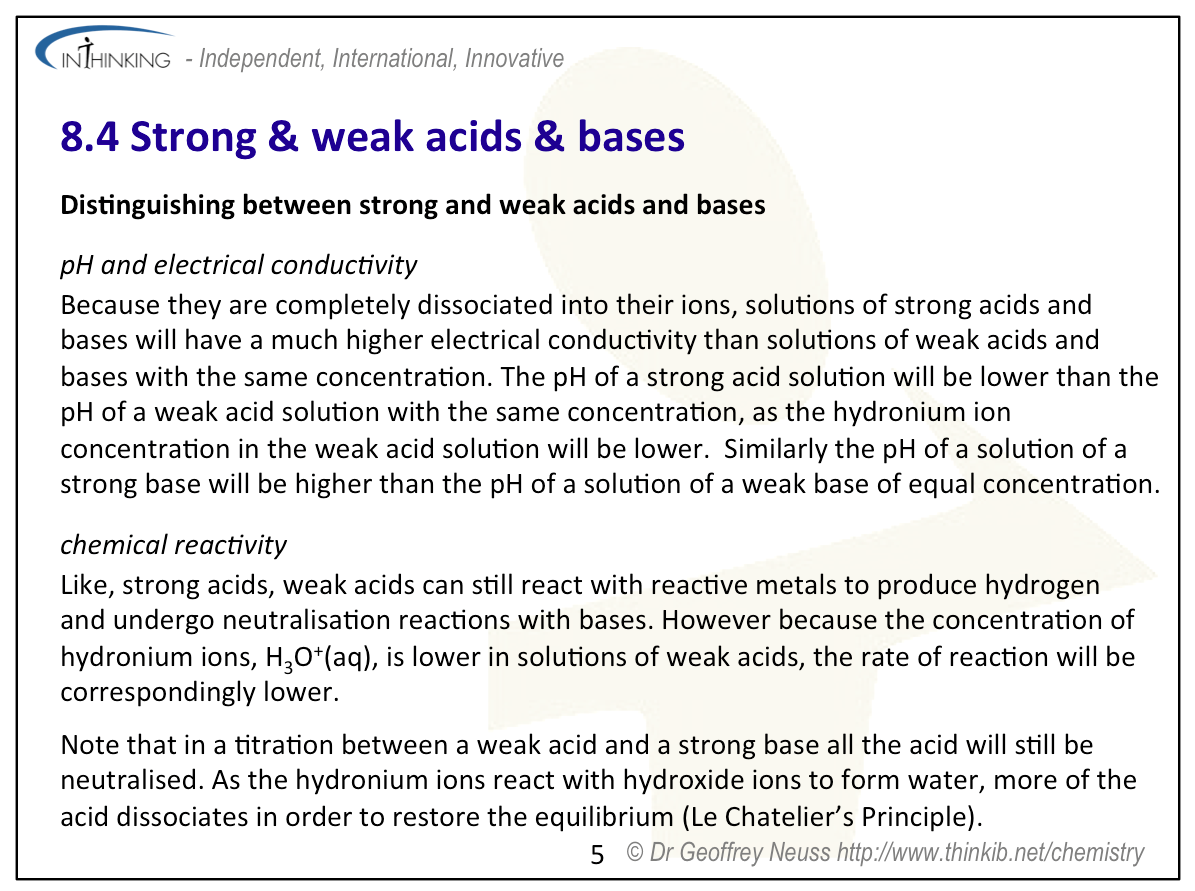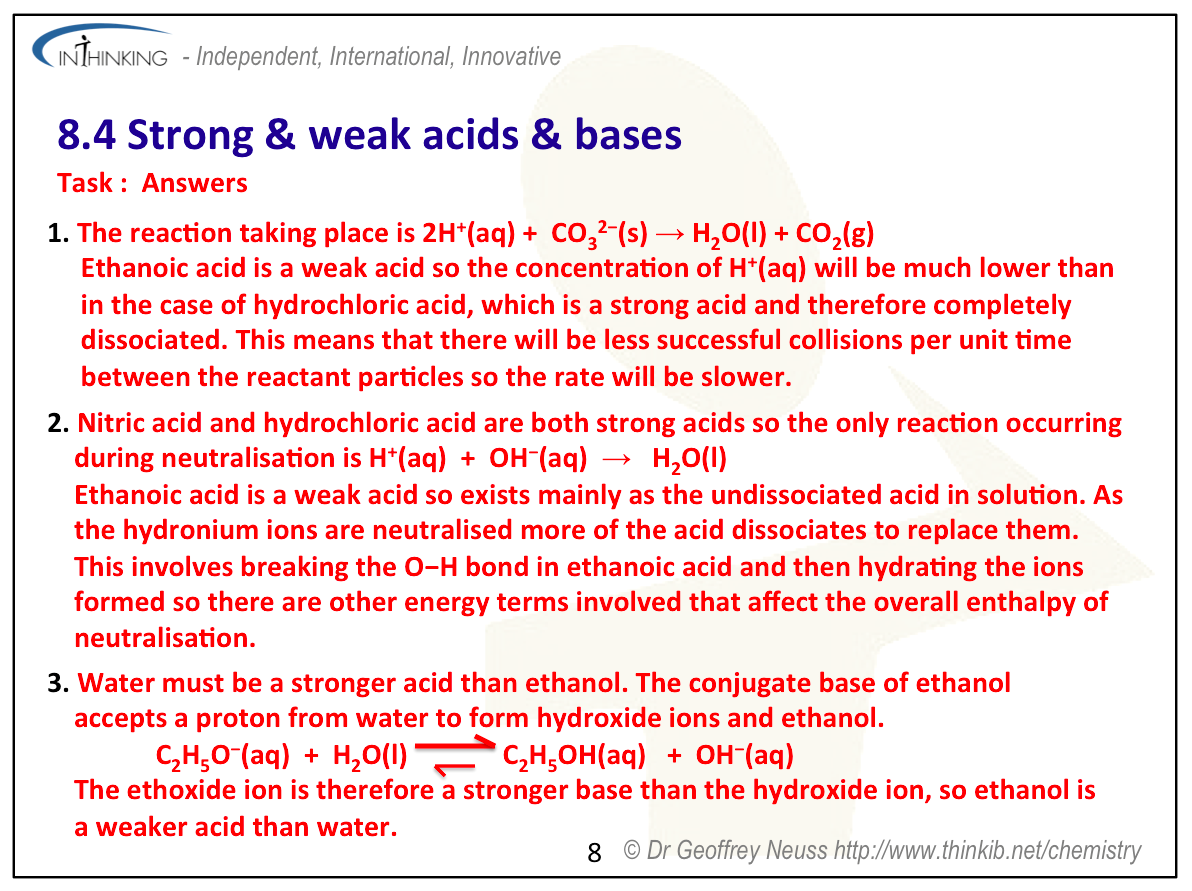 Page 61 QuestionsFor ten 'quiz' multiple choice questions with the answers explained see MC test: Strong & weak acids & bases. For short-answer questions which can be set as an assignment for a test, homework or given for self study together with model answers see Strong & weak acid & bases questions. Vocabulary listStrong acid / strong base IM, TOK, Utilization etc.See separate page which covers all of Topic 8. Practical work |