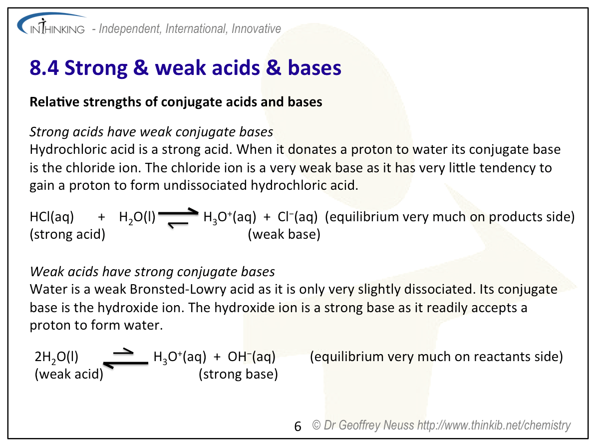 This sub-topic is really a very basic introduction to the differences between strong and weak as applied to acids and bases. Where it can get slightly tricky is when students are asked to determine the relative strengths of acids and bases from experimental data. This data might be conductivity measurements or more likely the extent of dissociation in water. Standard Level students should understand about acid (and base) dissociation constants as equilibrium constants are covered in the previous topic on equilibrium. but they are not expected to know specifically about pKa and pKb. It would not be unreasonable to give Standard Level students the values of Ka for two different weak acids and ask them which is the strongest.