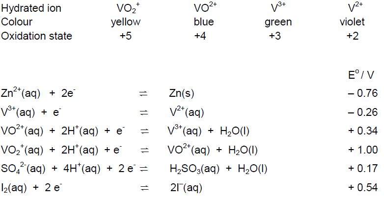 Given below are the colours of the different vanadium ions and some electrode potentials.