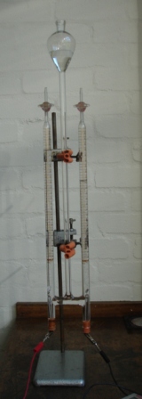 The electrolysis of the various solutions should be reasonably straightforward. The electrolysis of copper(II) sulfate using copper and/or graphite electrodes nicely illustrates the effect of changing the nature of the electrodes and the electrolysis of sodium chloride solution illustrates the effect of concentration. If you have a Hofman voltameter (see photograph on right) then it is well worth using it for the electrolysis of ‘water’ (dilute sulfuric acid or dilute sodium hydroxide solution) as it shows that exactly twice the volume of hydrogen gas is evolved compared to the volume of oxygen gas evolved. (This needs to run for a little while before it is exactly true as initially some of the oxygen evolved will dissolve in the dilute sulfuric acid until it becomes saturated). You can easily also show this using much simpler apparatus and just collecting the gases by displacing water from inverted test-tubes.