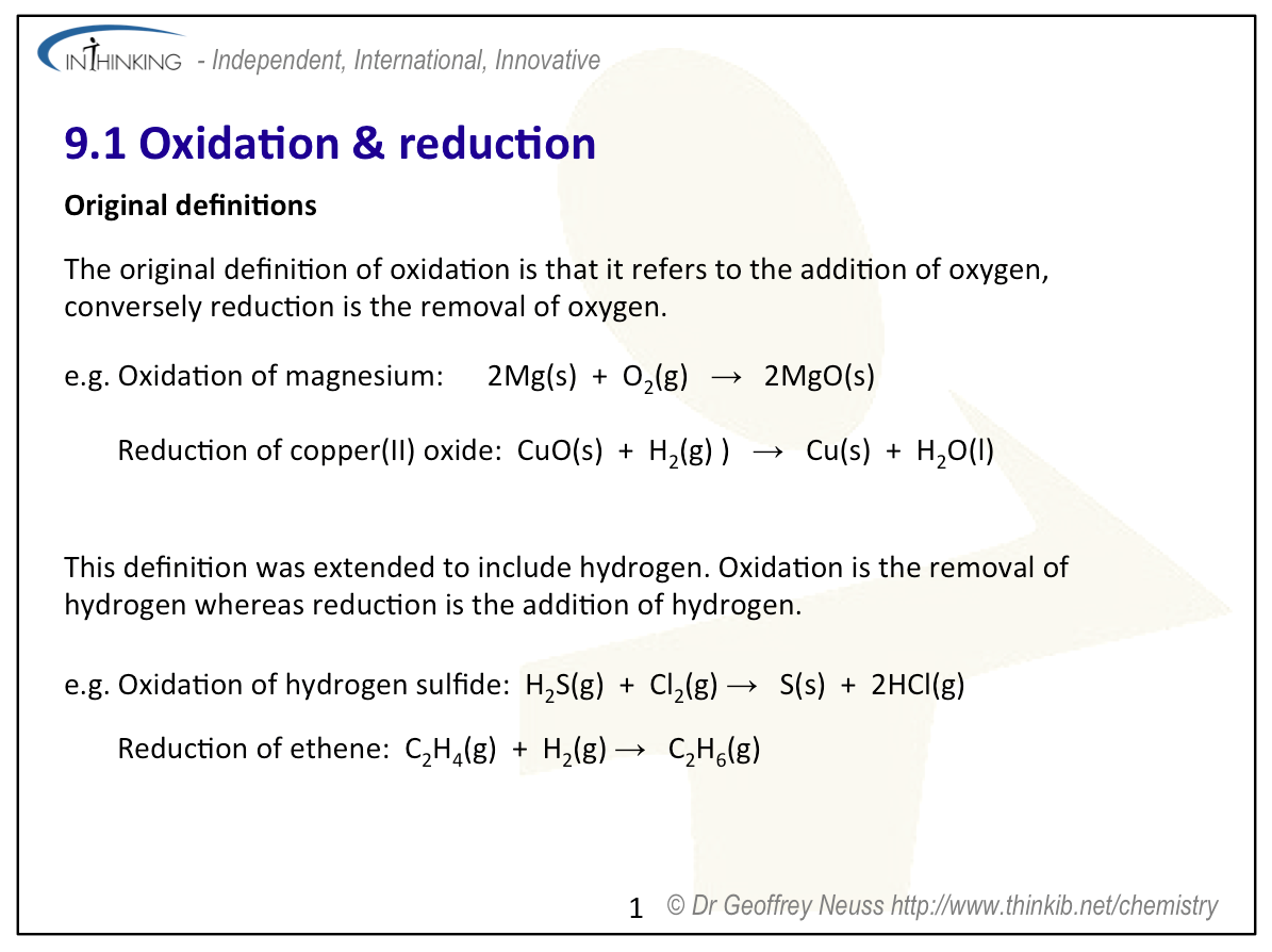 1. Definitions of oxidationWe should encourage students to think critically and ask searching questions. In the previous syllabus this topic started with the definition that oxidation is the loss of electrons. In this new programme it states "Oxidation and reduction can be considered in terms of oxygen gain/hydrogen loss, electron transfer or change in oxidation number". It is worth examining this statement.
