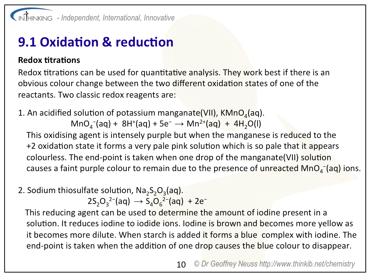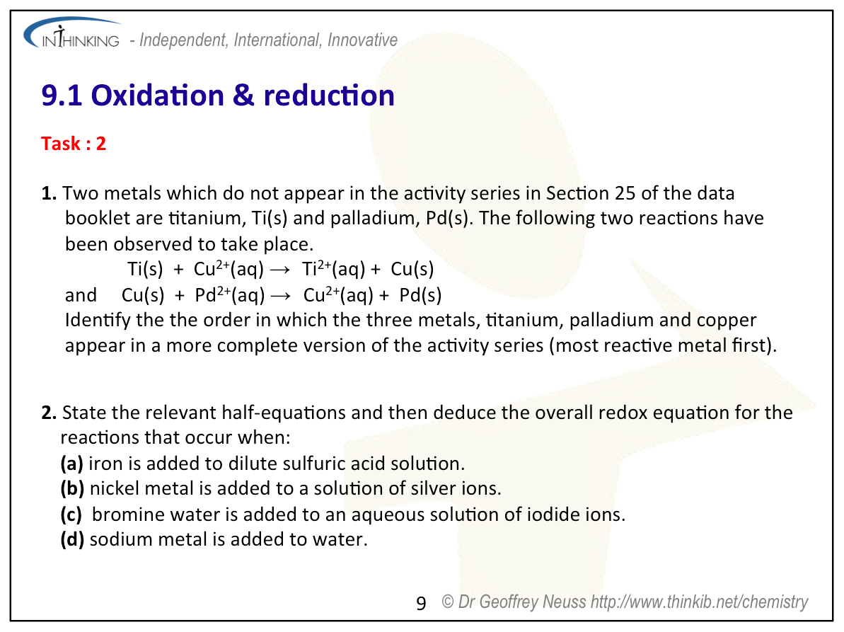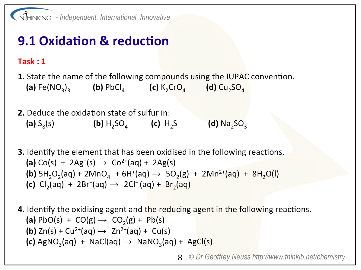 Pages 70 - 72 QuestionsFor ten 'quiz' multiple choice questions with the answers explained see MC test: Oxidation & reduction. For three different sets of short-answer questions which can be set as an assignment for a test, homework or given for self study together with model answers see Oxidation & reduction questions (1), Oxidation & reduction questions (2) and Oxidation & reduction questions (3). Vocabulary list:Oxidation IM, TOK, 'Utilization' etc.See separate page which covers all of Topic 9. Practical work |