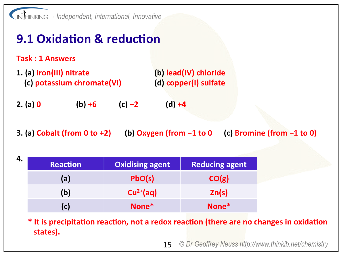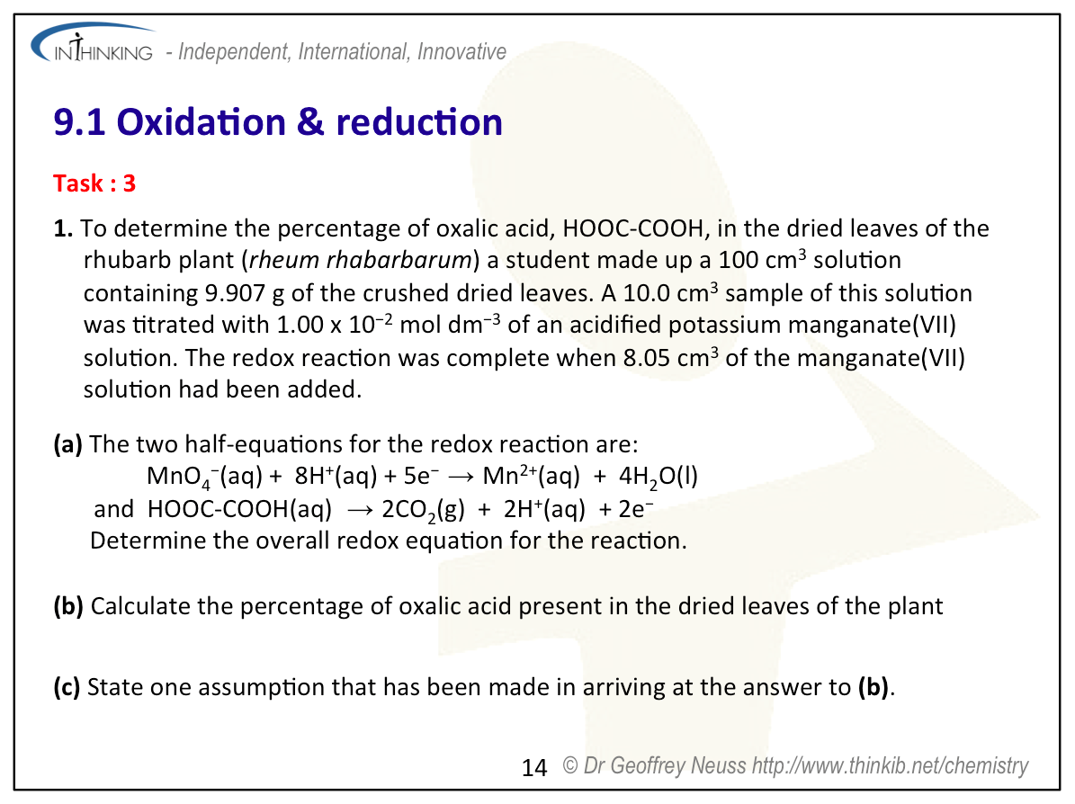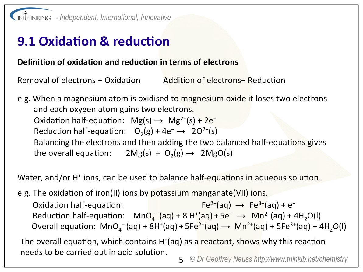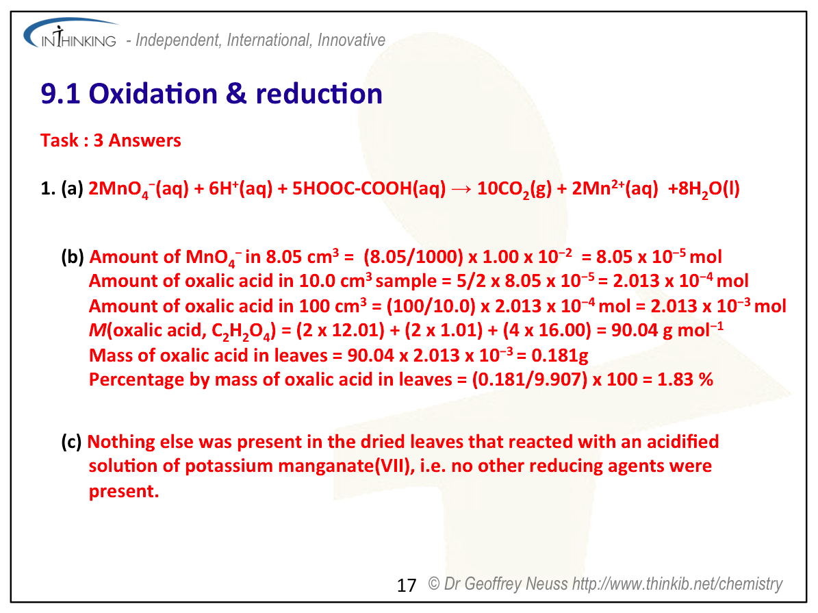 Pages 70 - 72 QuestionsFor ten 'quiz' multiple choice questions with the answers explained see MC test: Oxidation & reduction. For three different sets of short-answer questions which can be set as an assignment for a test, homework or given for self study together with model answers see Oxidation & reduction questions (1), Oxidation & reduction questions (2) and Oxidation & reduction questions (3). Vocabulary list:Oxidation IM, TOK, 'Utilization' etc.See separate page which covers all of Topic 9. Practical work |