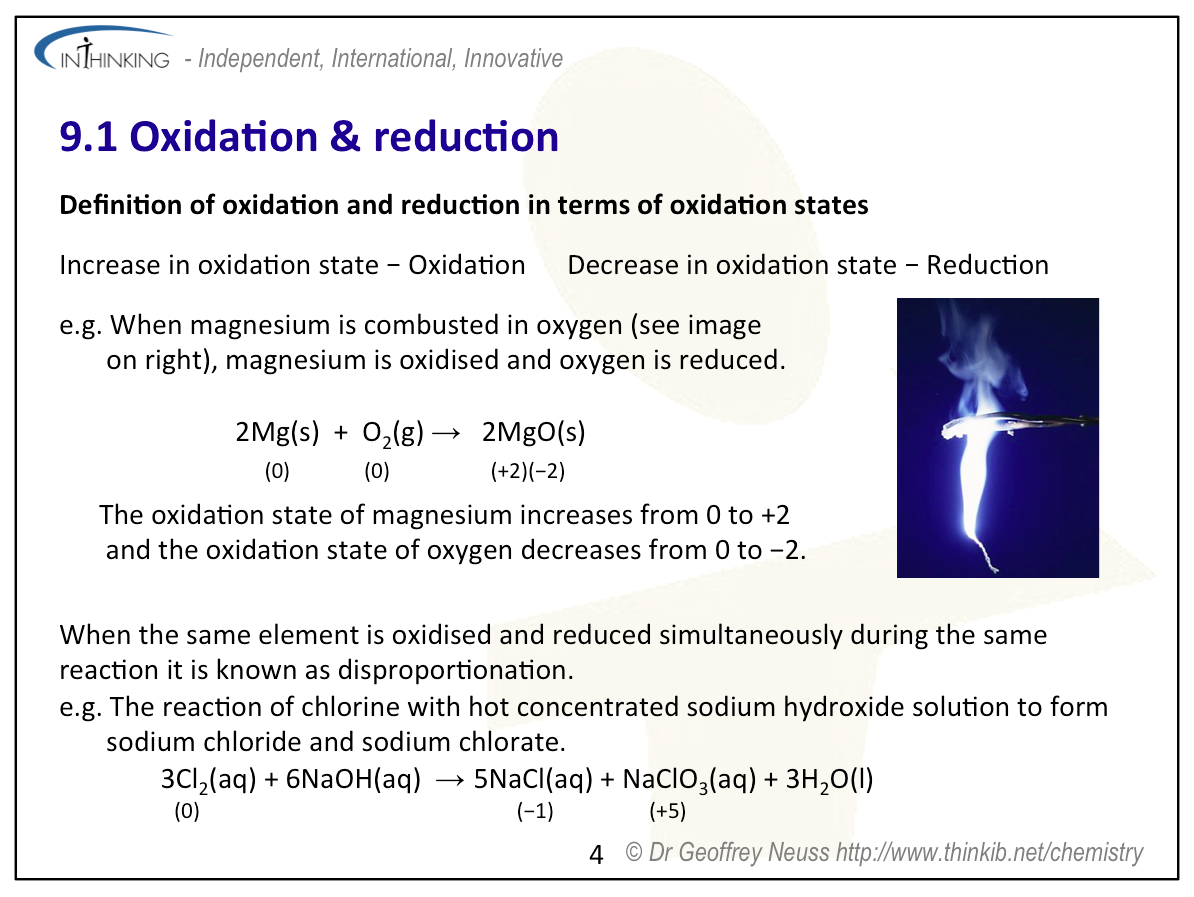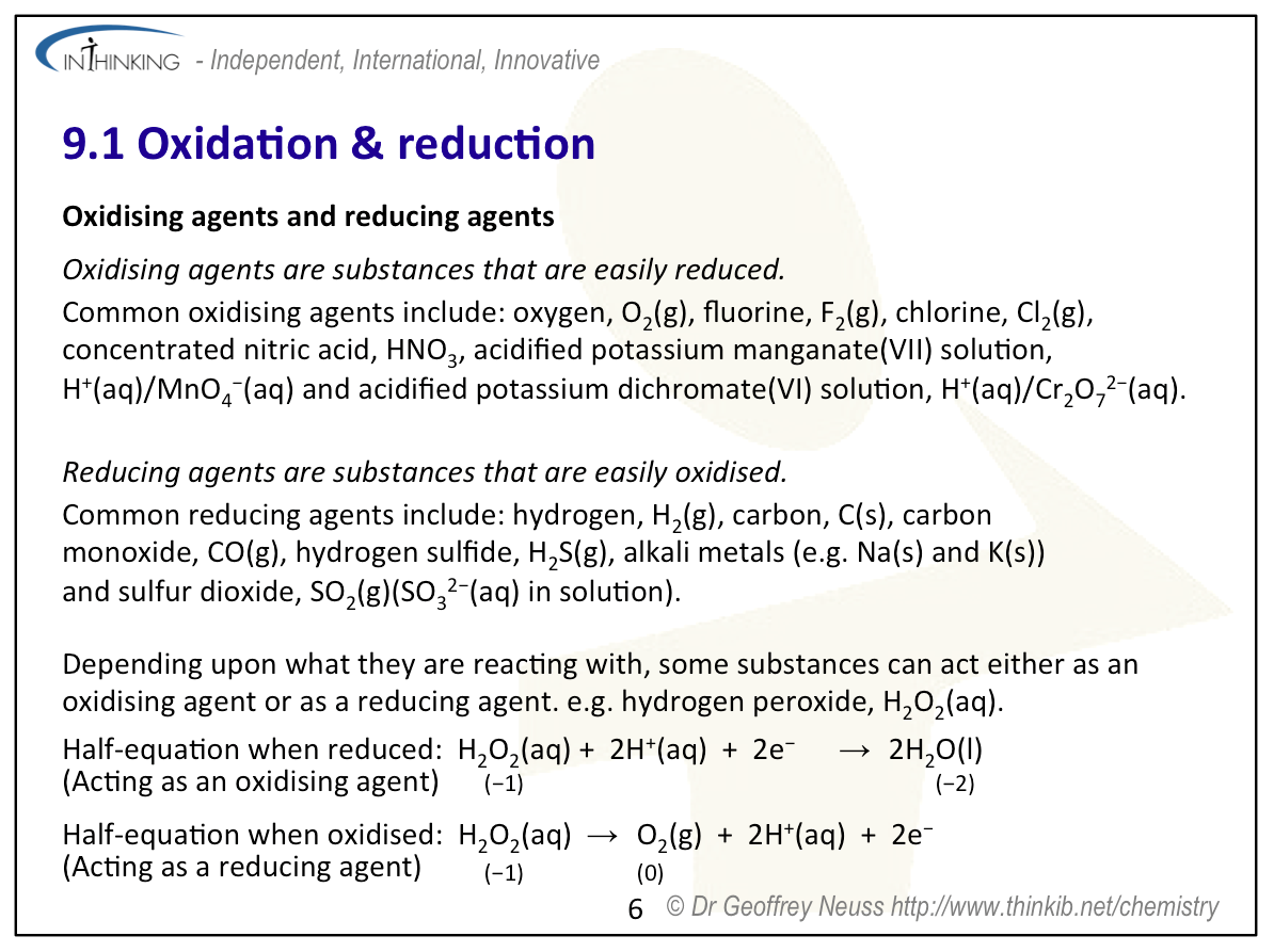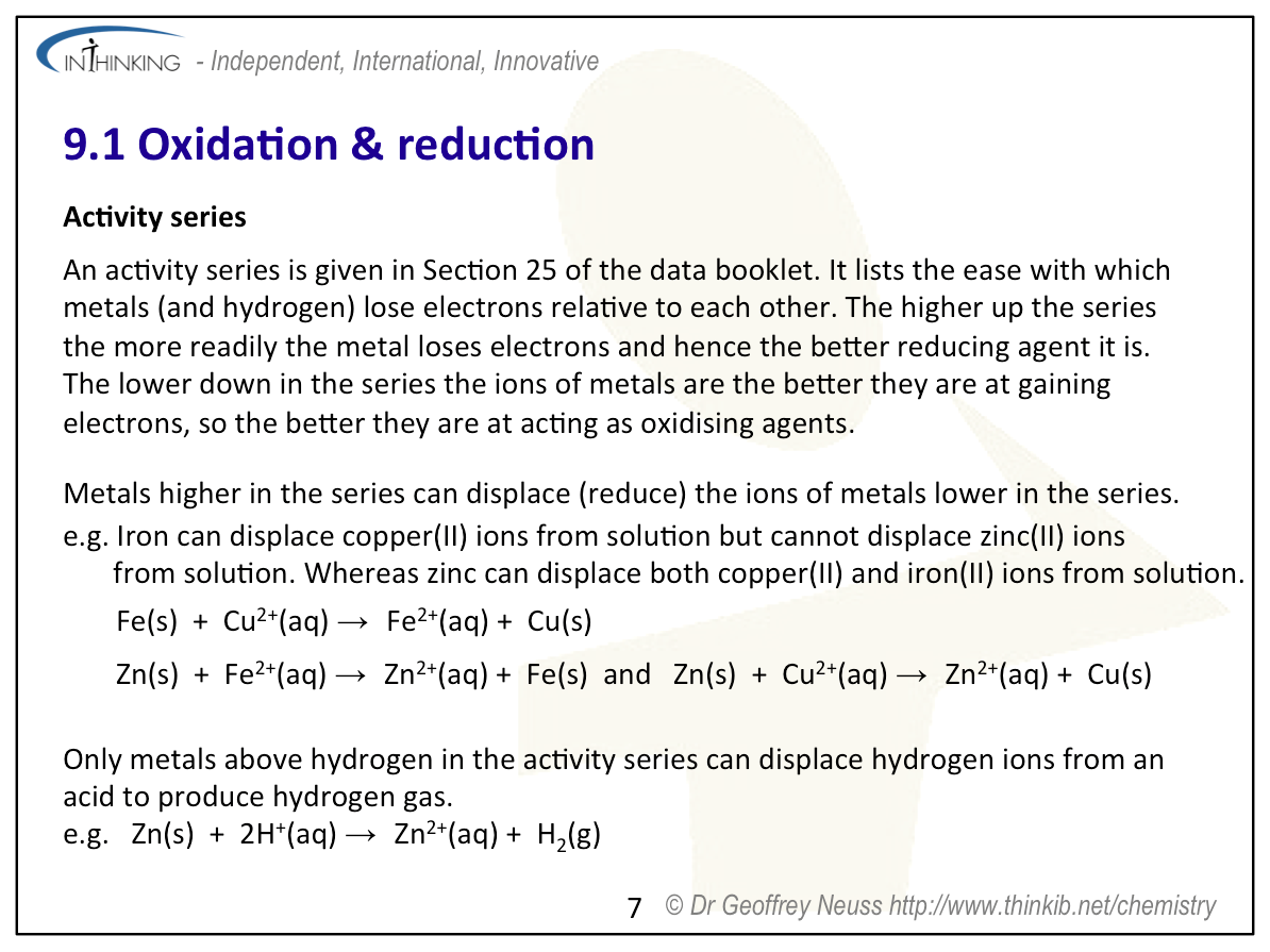 | Clarification notesAlthough oxidation number and oxidation state are often used interchangeably IUPAC does formally distinguish between the two terms. According to IUPAC oxidation numbers are represented by Roman numerals and oxidation states should be represented with the sign given before the number, e.g. +3 and not 3+. The oxidation state of hydrogen (-1) in metal hydrides and oxygen (-1) in peroxides should be known. An activity series is given in Section 25 of the data booklet. International-mindednessThe United Nations recognises access to a supply of clean drinking water as a fundamental human right. Even so, over one billion people in the world are thought to lack this basic provision. Oxidizing agents, such as chlorine or ozone, are commonly used to disinfect water by killing microbial pathogens. |