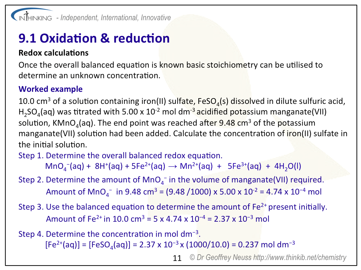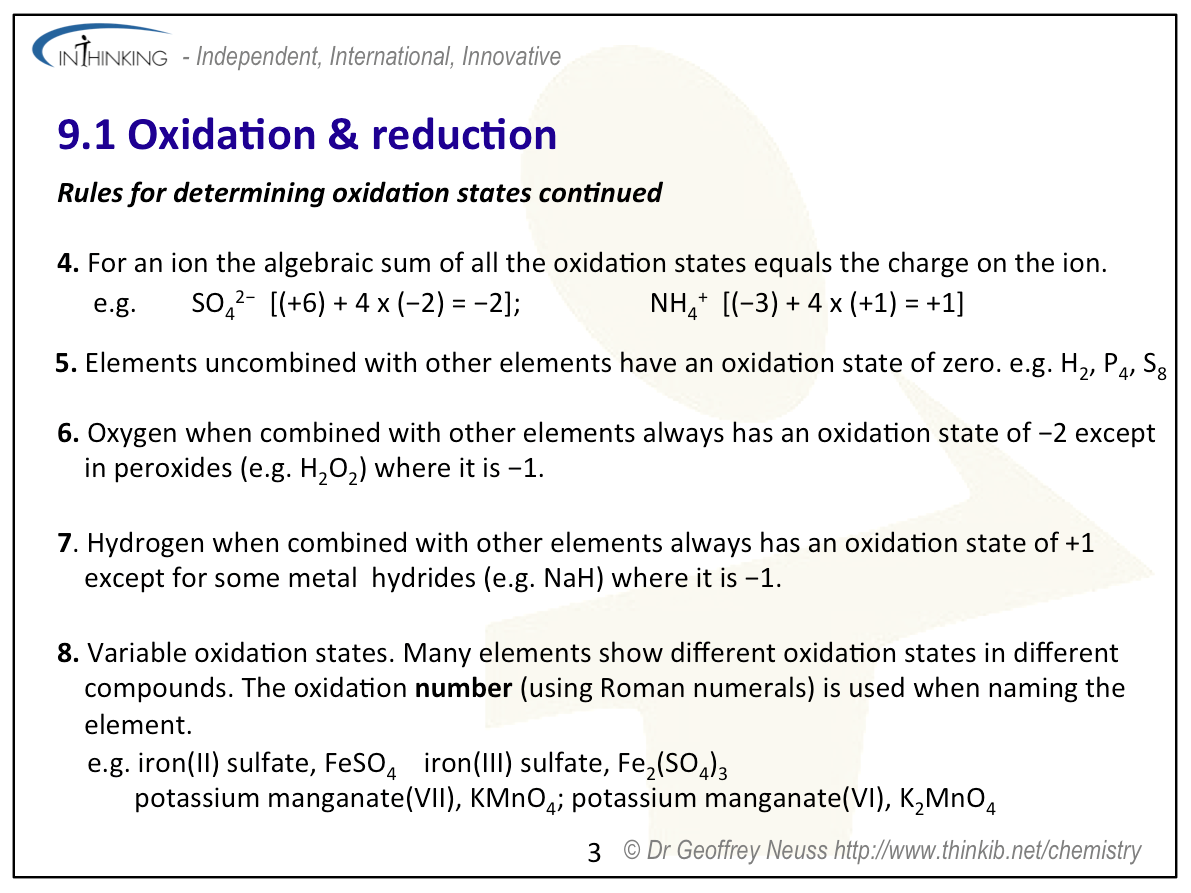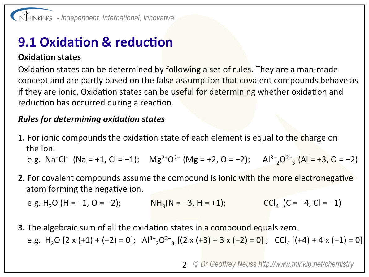 | Clarification notesAlthough oxidation number and oxidation state are often used interchangeably IUPAC does formally distinguish between the two terms. According to IUPAC oxidation numbers are represented by Roman numerals and oxidation states should be represented with the sign given before the number, e.g. +3 and not 3+. The oxidation state of hydrogen (-1) in metal hydrides and oxygen (-1) in peroxides should be known. An activity series is given in Section 25 of the data booklet. International-mindednessThe United Nations recognises access to a supply of clean drinking water as a fundamental human right. Even so, over one billion people in the world are thought to lack this basic provision. Oxidizing agents, such as chlorine or ozone, are commonly used to disinfect water by killing microbial pathogens. |
