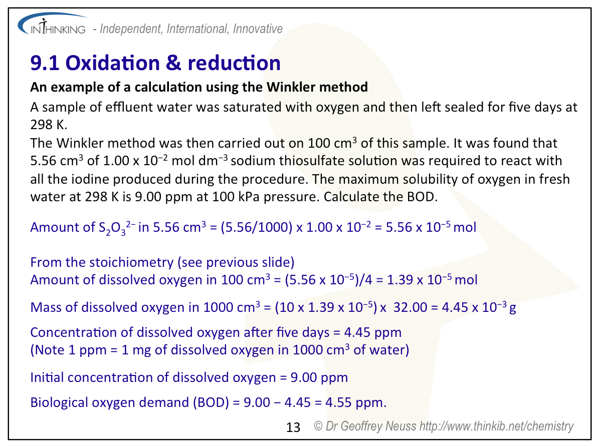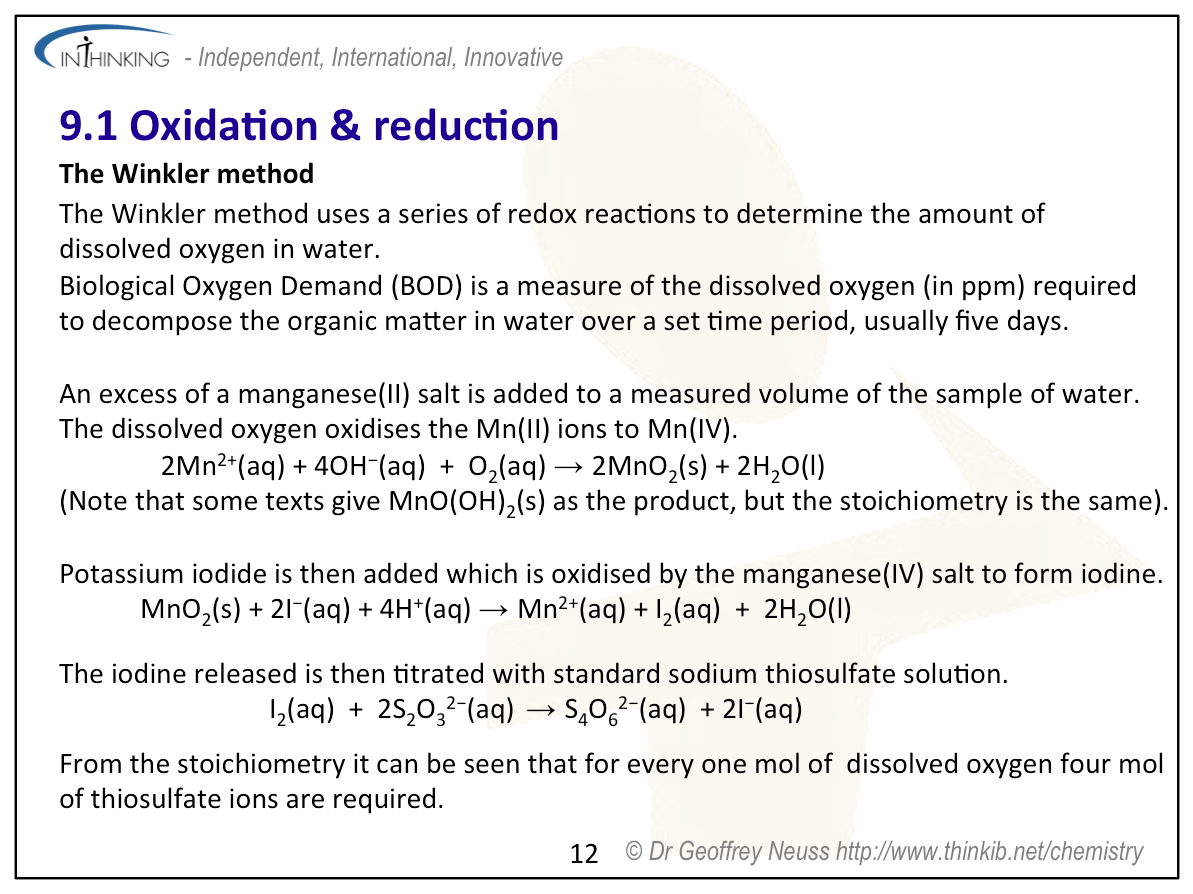 The syllabus now includes one very specific environmental application of redox processes - the determination of dissolved oxygen in water. In fact the syllabus goes slightly further than this as it relates the amount of dissolved oxygen to the biochemical oxygen demand (BOD). Although this provides a good example to test whether students can apply redox equations when performing calculations it is rather out of date as modern methods to determine BOD bypass this procedure and simply use an oxygen probe (sensor) connected to a data logger (see other resources 3 below).