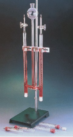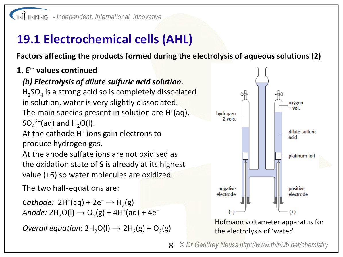 Position in the electrochemical series. This is almost completely limited to the position of metals and their ions and, of course, hydrogen and water. The obvious examples to include here are the electrolysis of dilute sodium hydroxide solution which behaves as 'water' (as hydrogen is evolved in preference to sodium) and the electrolysis of copper(II) sulfate solution with inert electrodes (where copper is deposited in preference to hydrogen ions gaining electrons). The position of negative ions is not really required by the IB as under normal conditions hydroxide ions will give up electrons in preference to other anions. The obvious example of this is the electrolysis of 'water' using dilute sulfuric acid. It is nice to show this using a Hofmann voltameter (right) although this particular piece of apparatus is not on the syllabus as such.