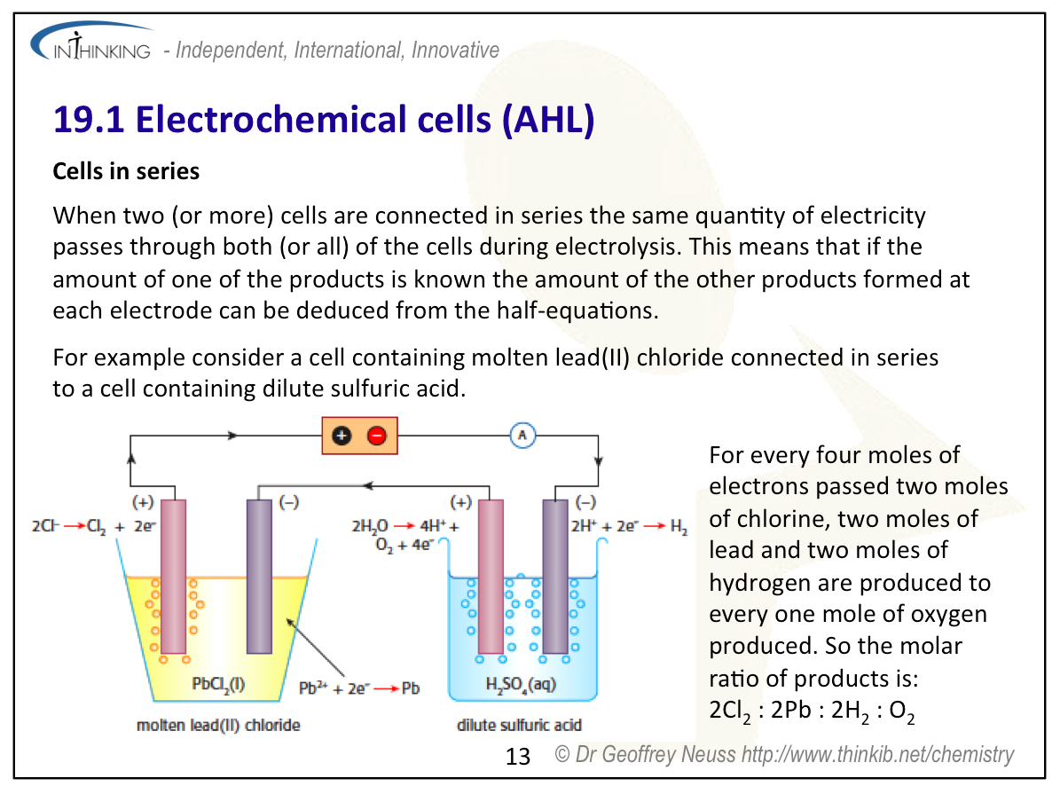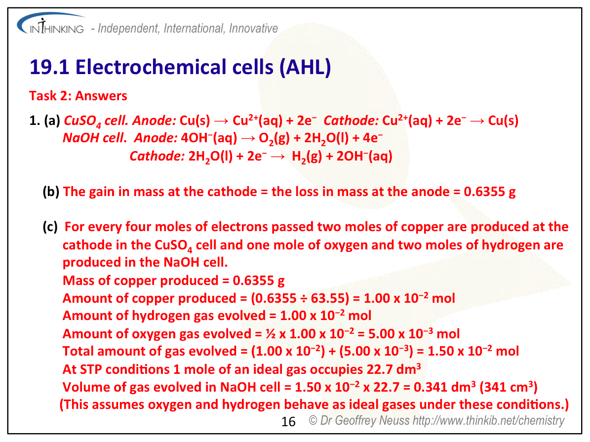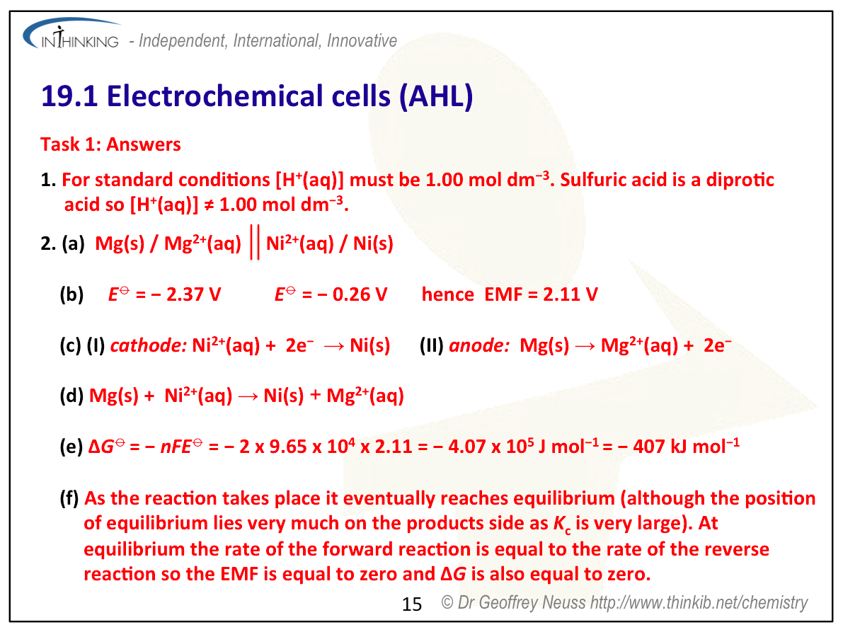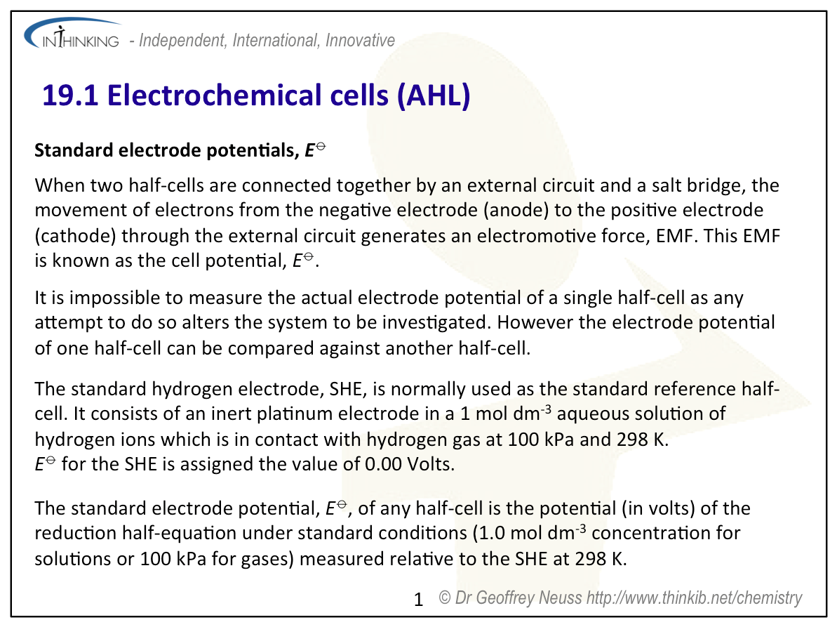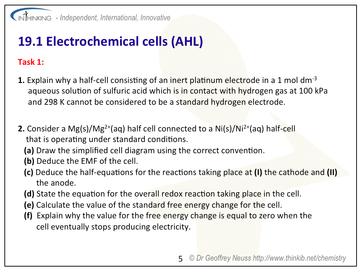 Pages 74 - 76 QuestionsFor ten 'quiz' multiple choice questions with the answers explained see MC test: Electrochemical cells (AHL). For short-answer questions on voltaic cells which can be set as an assignment for a test, homework or given for self study together with model answers see Electrochemical cells (1) (AHL) questions and for a second set of short-answer questions on electrolytic cells see Electrochemical cells (2) (AHL) questions. Vocabulary list:Standard electrode potential, E IM, TOK, 'Utilization' etc.See separate page which covers all of Topic 9 & 19. Practical work |