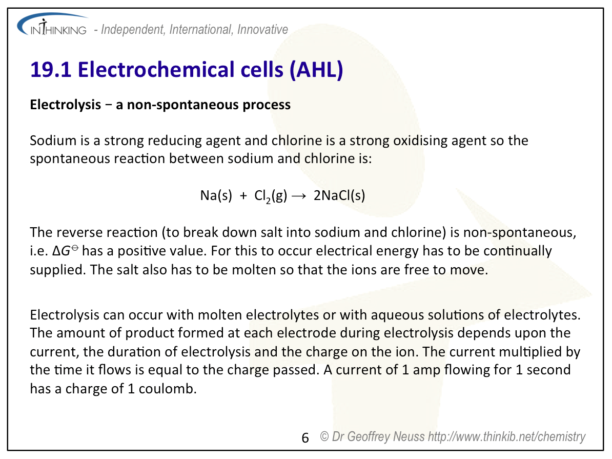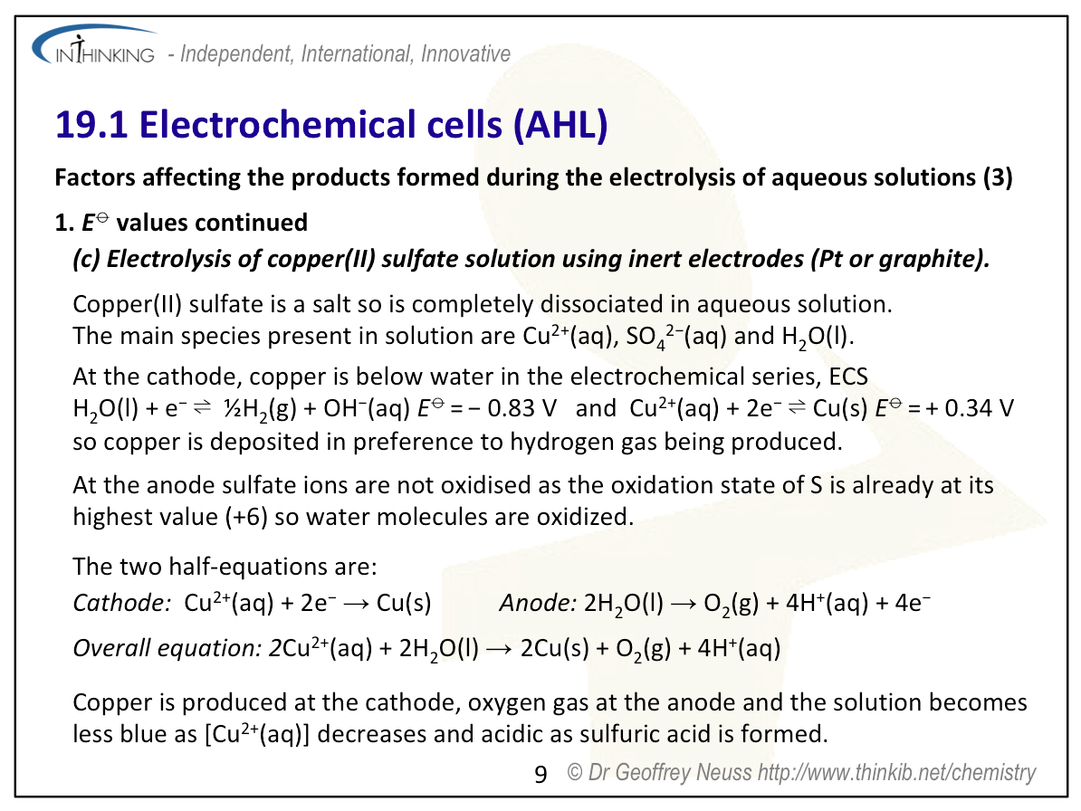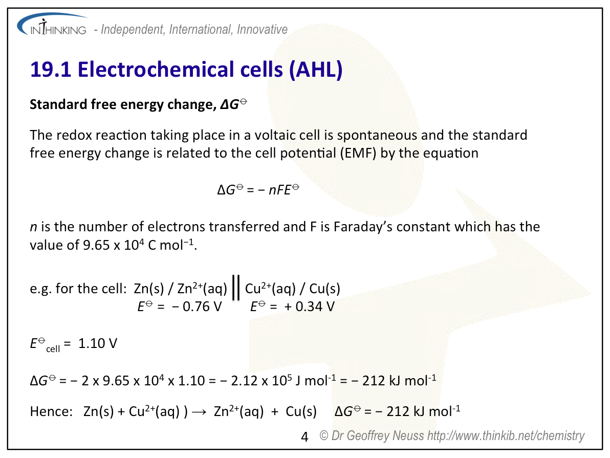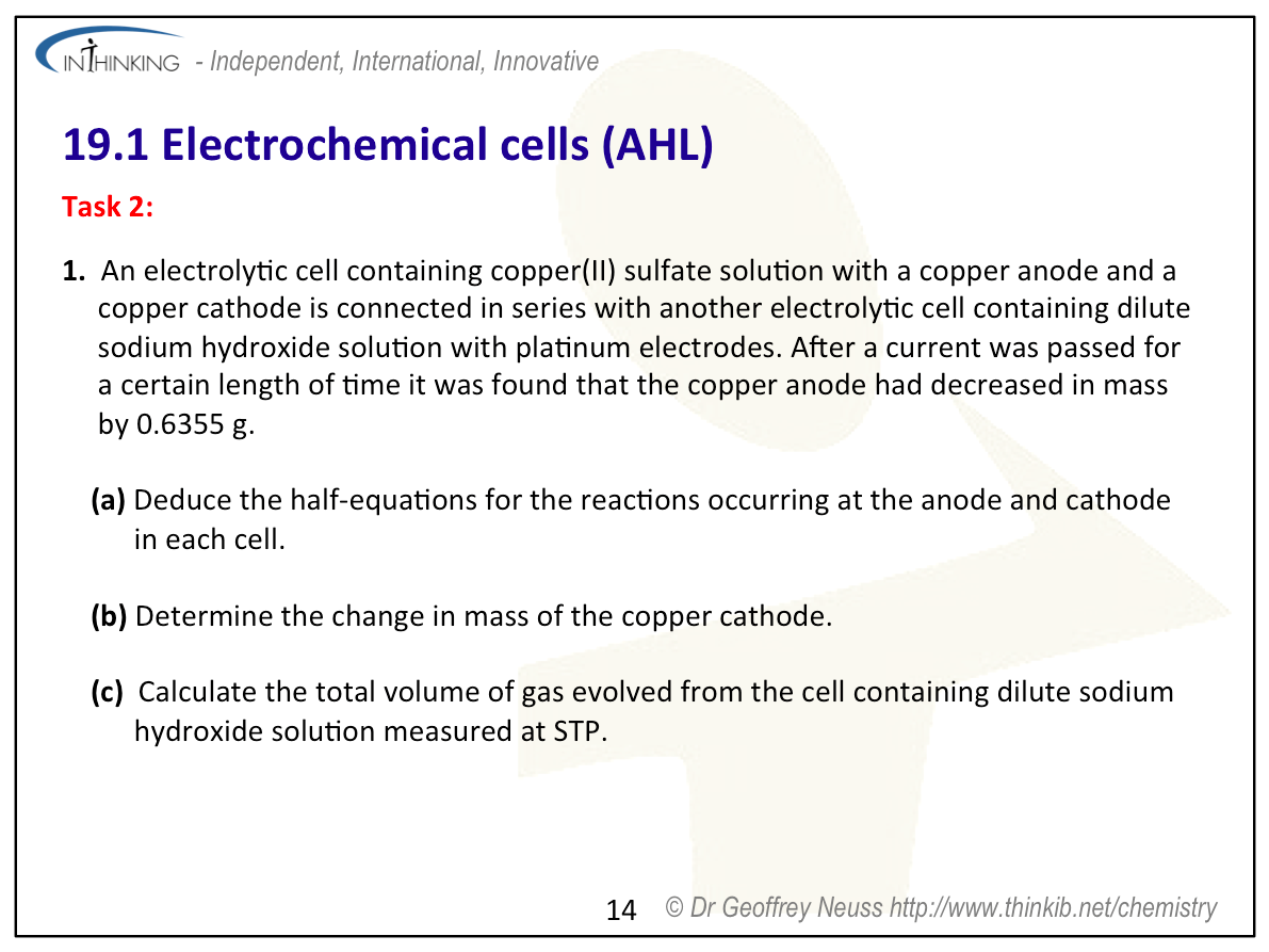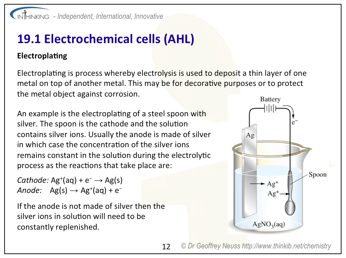 Pages 74 - 76 QuestionsFor ten 'quiz' multiple choice questions with the answers explained see MC test: Electrochemical cells (AHL). For short-answer questions on voltaic cells which can be set as an assignment for a test, homework or given for self study together with model answers see Electrochemical cells (1) (AHL) questions and for a second set of short-answer questions on electrolytic cells see Electrochemical cells (2) (AHL) questions. Vocabulary list:Standard electrode potential, E IM, TOK, 'Utilization' etc.See separate page which covers all of Topic 9 & 19. Practical work |