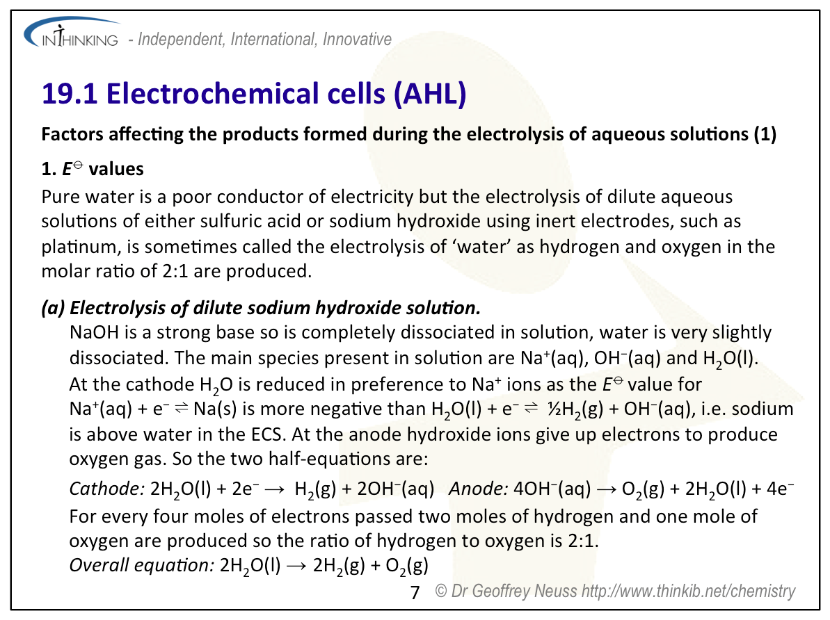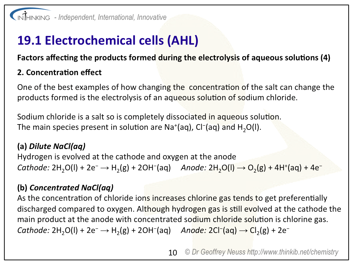 Concentration of the electrolyte. The classic example here is sodium chloride solution. For dilute solutions the products are almost exclusively hydrogen and oxygen but as the solution becomes more concentrated chlorine rather than oxygen is evolved at the positive electrode (anode) although a mixture containing both gases is actually formed. This is fertile ground for many a chemistry Extended Essay and could perhaps also be used for the individual scientific investigation.