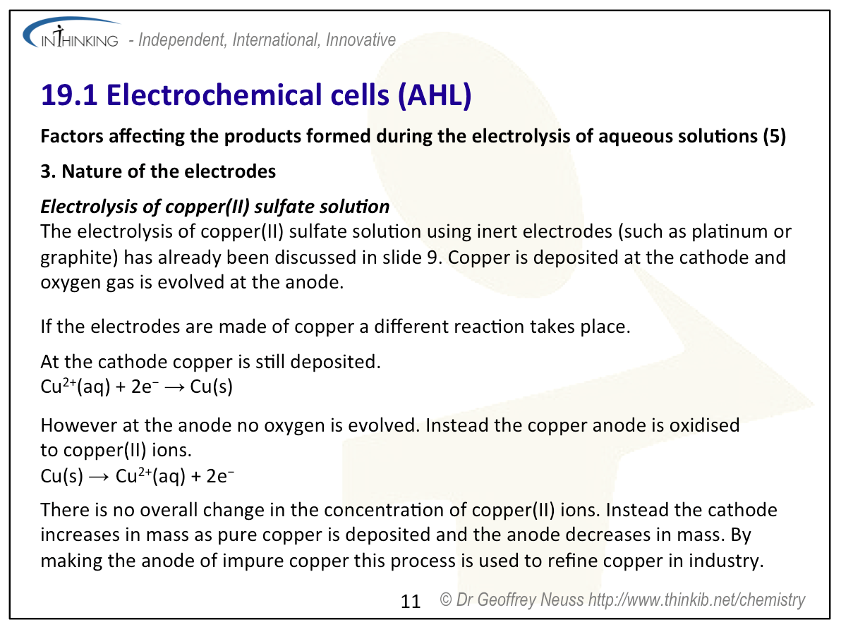 Teaching tipsIt would be nice to be able to teach about standard redox potentials through relevant practical work - unfortunately I have yet to come across a school with its own standard hydrogen electrode. In fact relating all the E⦵ values to the hydrogen electrode seems strange to students (and perhaps teachers as well) as it is not immediately obvious why a gas (which does not conduct electricity) should be chosen as a standard. It is further complicated because most of the diagrams show hydrogen bubbling out from under the surface of the acid which means that the pressure must be greater than one atmosphere. What you can do though is build upon the core and construct an electrochemical series using Cu(s)/Cu2+(aq) as the standard and then shift all the values by 0.34 V after talking about why hydrogen is used. What is important is to impress upon students that the actual electrode potential is not known and cannot be measured - the Electrochemical Series is simply a table of relative values. Once they understand the concept they need plenty of practice at writing the relevant half-equations making sure that the half-cell with the more negative E⦵ value is the one that gives up electrons. They can also see that a species can act either as an oxidizing or reducing agent depending upon the standard electrode potential of the other half-cell. You will need to discuss the relationship between ΔG and E⦵ and bring in the Faraday constant, F. Explain that when the cell reaches equilibrium then both ΔG and E⦵ will be zero. Although students are given the value of F they do not need to use it to solve electrolysis calculations as the syllabus clearly says that they only need to determine relative amounts but they will need to realise that the same quantity of electricity passes through two different electrolytic cells when they are connected in series. The practical Electrolytic cells is well worth doing to reinforce the theory of electrolysis in solution. Students must realise that unlike a voltaic cell an electrolytic cell is a non-spontaneous process. Electricity needs to be put in to drive the reaction in the opposite direction to what happens in a voltaic cell. Too often when marking Paper 2 I see diagrams of electrolytic cells with voltmeters and salt-bridges and electrochemical cells powered by an external battery! | Study guide