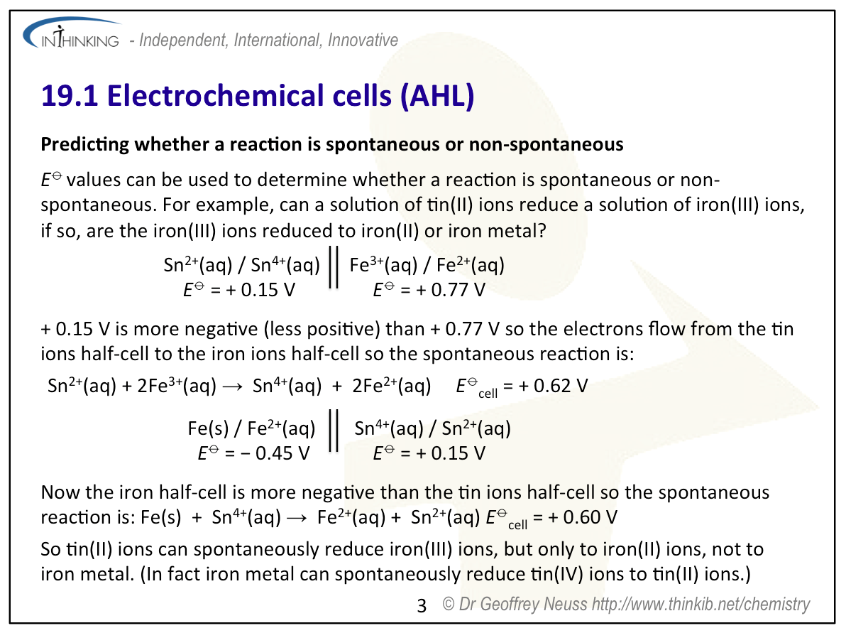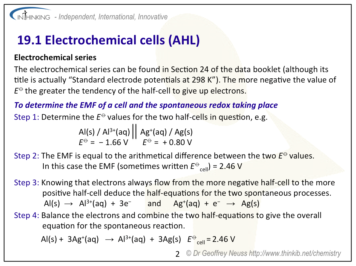 If all this is understood students will be able to answer any questions thrown at them on the use of standard electrode potentials. I have written a separate page under Areas of difficulty for Paper 2 which gives some more examples.
