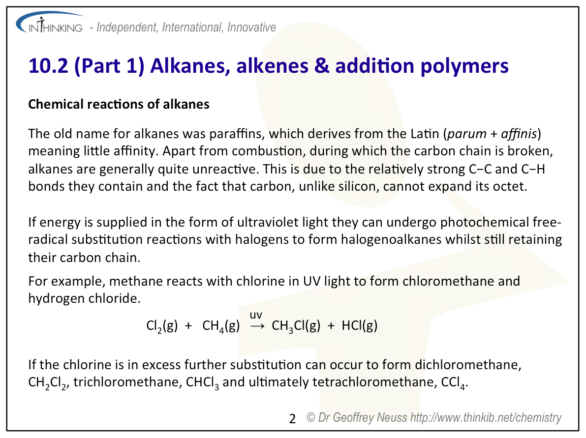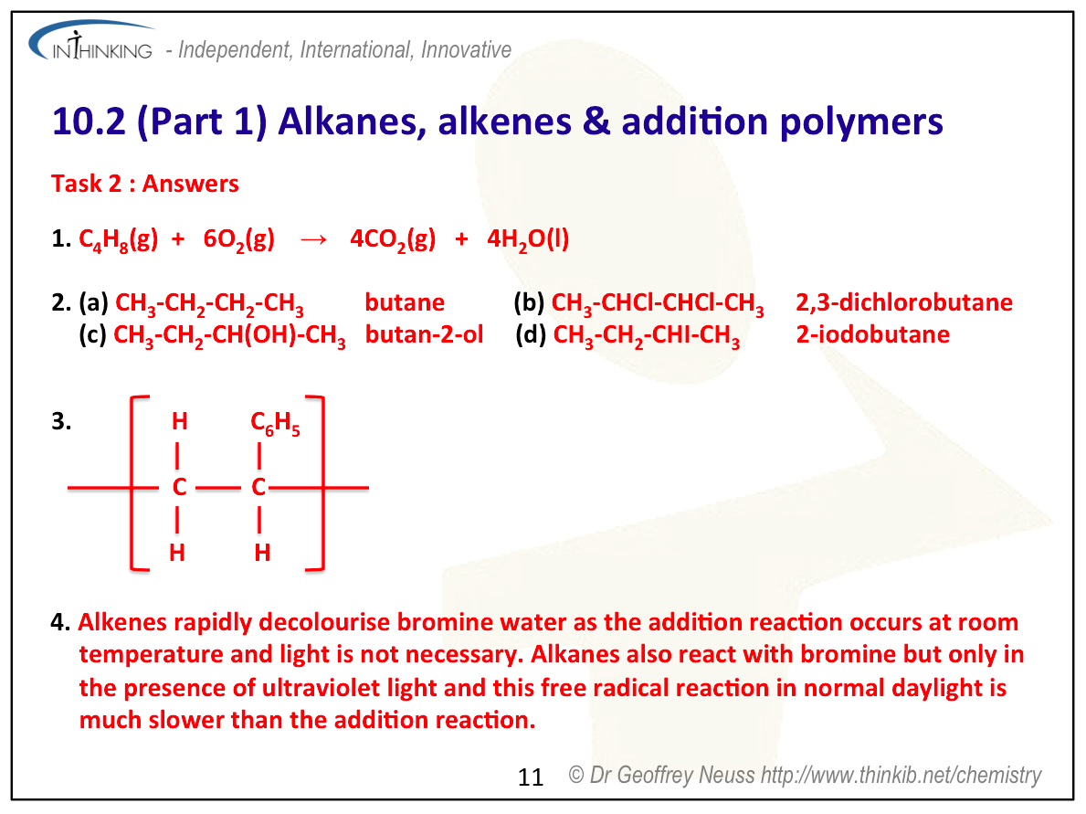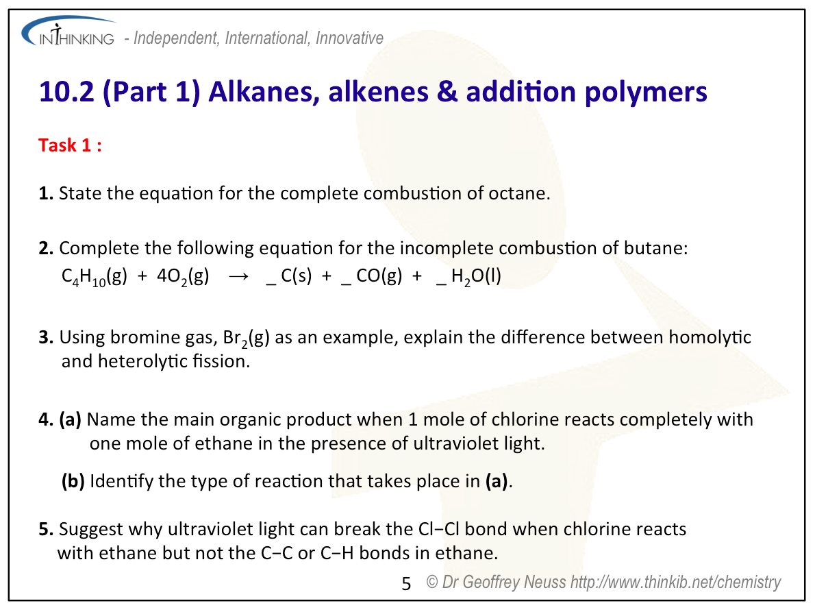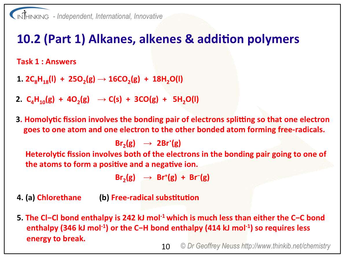 Pages 85 & 86 QuestionsFor ten 'quiz' multiple choice questions with the answers explained see MC test: Alkanes, alkenes & addition polymers. For short-answer questions on alkanes which can be set as an assignment for a test, homework or given for self study together with model answers see Alkanes questions. For short-answer questions on alkenes which can be set as an assignment for a test, homework or given for self study together with model answers see Alkenes questions. Vocabulary listhomolytic fission IM, TOK, Utilization etc.See separate page which covers all of Topic 10 Practical work