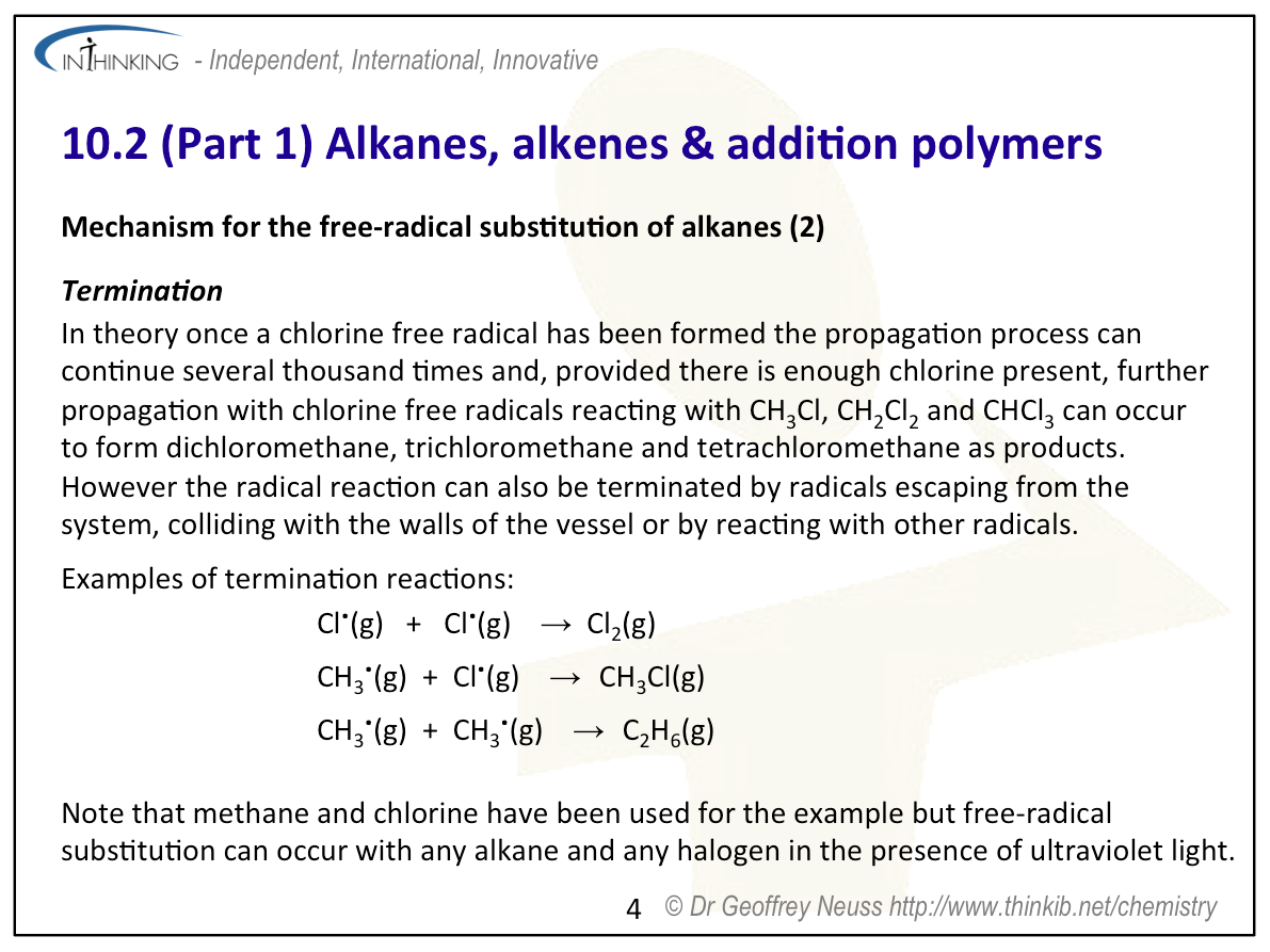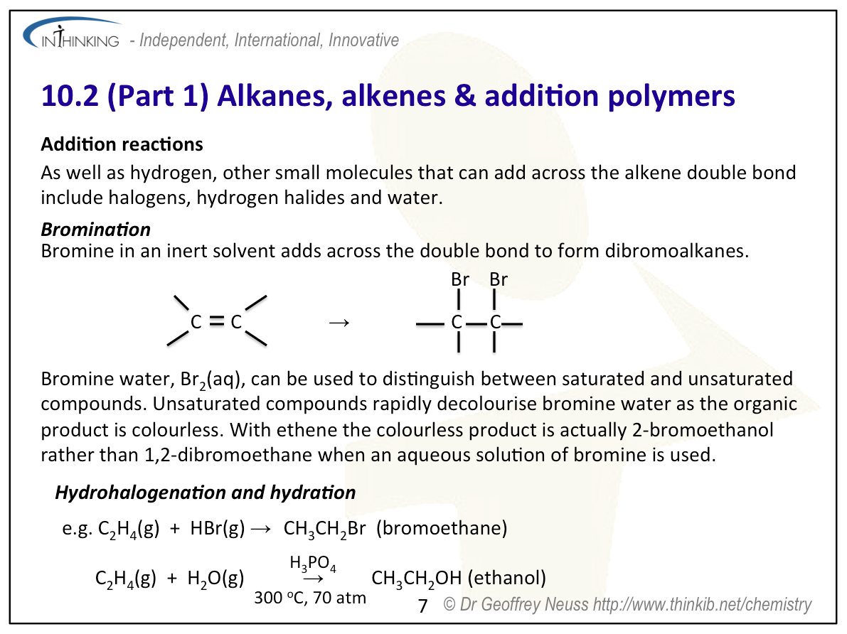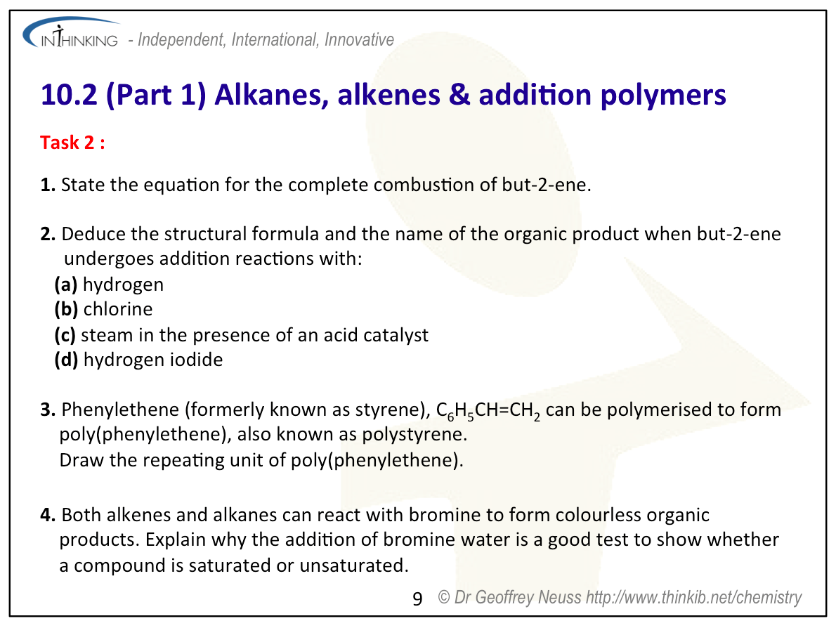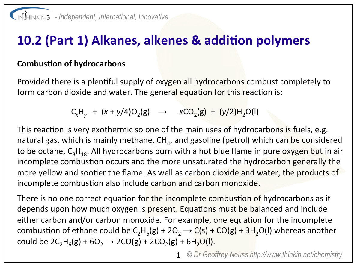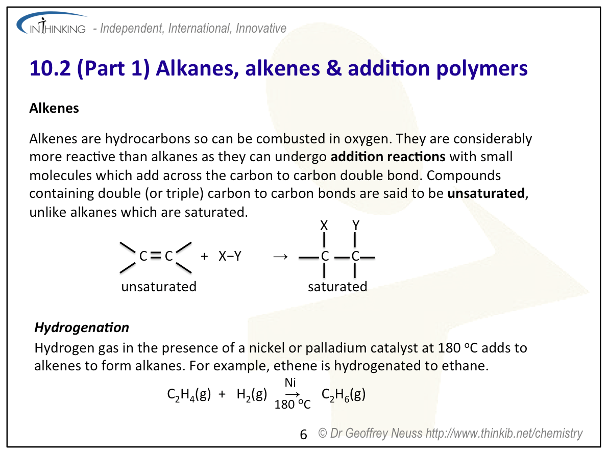 Pages 85 & 86 QuestionsFor ten 'quiz' multiple choice questions with the answers explained see MC test: Alkanes, alkenes & addition polymers. For short-answer questions on alkanes which can be set as an assignment for a test, homework or given for self study together with model answers see Alkanes questions. For short-answer questions on alkenes which can be set as an assignment for a test, homework or given for self study together with model answers see Alkenes questions. Vocabulary listhomolytic fission IM, TOK, Utilization etc.See separate page which covers all of Topic 10 Practical work
