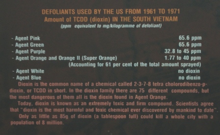 This set of reactions has been designed to work well. It perhaps typifies a really good Chemistry experiment which demonstrates the theory and asks students searching questions to ensure that they fully understand the underlying Chemistry. It can also be used to exemplify some social and ethical issues as one famous chloro-organic compound is dioxin. Many students will have heard of dioxin. It was infamously used in the Vietnam War during the 1960 and 1970s. The Americans used it in a compound called ‘Agent Orange’. It was not chemical warfare as such because it was used as a defoliant rather than specifically targeted against people but it had the unfortunate affect of causing many birth deformities. I took the photograph when I visited the War Remnant Museum in Ho Chi Minh City (formerly known as Saigon).