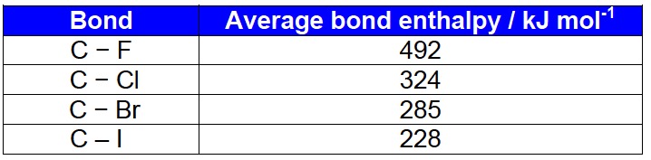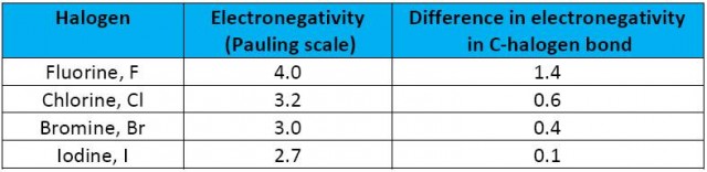 halogen (i.e. the leaving group)', there is no mention in the 'Guidance' as to exactly what explanation is required. The syllabus and some books talk about the halogen being a 'leaving group' and it is the ease with which this group leaves that is the important factor, not the polarity of the bond. The ease with which the halogen leaves is, of course related to the strength of the carbon-halogen bond. Iodo- compounds are the most reactive because the carbon-iodine bond is very weak compared to the other carbon-halogen bonds. The fact that the carbon to fluorine bond is so strong accounts for the inertness of fluorocarbons even though they have high polarity.