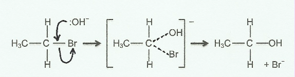 Although 'correct' in 2-D there are two big problems. The first is that the existing electron pair forming the C-Br bond will repel the incoming electrons and the second is that the angle between the C….OH and C....Br bonds in the transition state looks to be 90o or even less. In reality the hydroxide nucleophile will approach the δ+ carbon atom of the polar C—Br bond from the opposite side. This means that the bond angle between the C....OH and the C....Br bonds in the transition state will be 180o. This can easily be shown using a 3-D representation and avoids all the problems caused by a 2-D diagram.