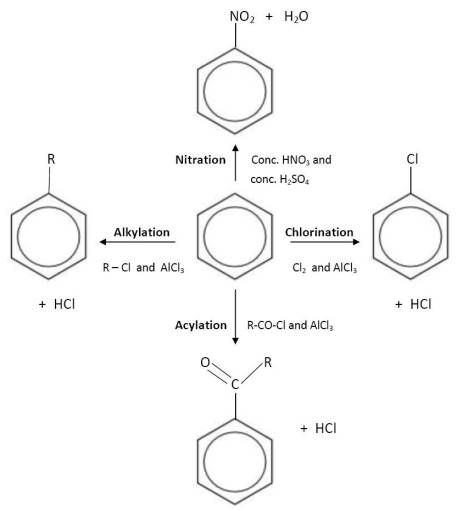 The syllabus seems to limit the mechanism of electrophilic substitution reactions just to the nitration of benzene. This is a pity as once the idea of attack by an electrophile is understood benzene can be converted into many different classes of compounds by essentially the same reaction. In all of these reactions one of the hydrogen atoms in the benzene ring is substituted by an electrophile. The function of the H2SO4 in nitration and the halogen carrier, AlCl3, in chlorination, alkylation and acylation is to produce the electrophile. These catalysts do this by accepting a pair of electrons from the reacting species, HNO3, Cl2, RCl and ROCl, i.e. by functioning as Lewis acids.