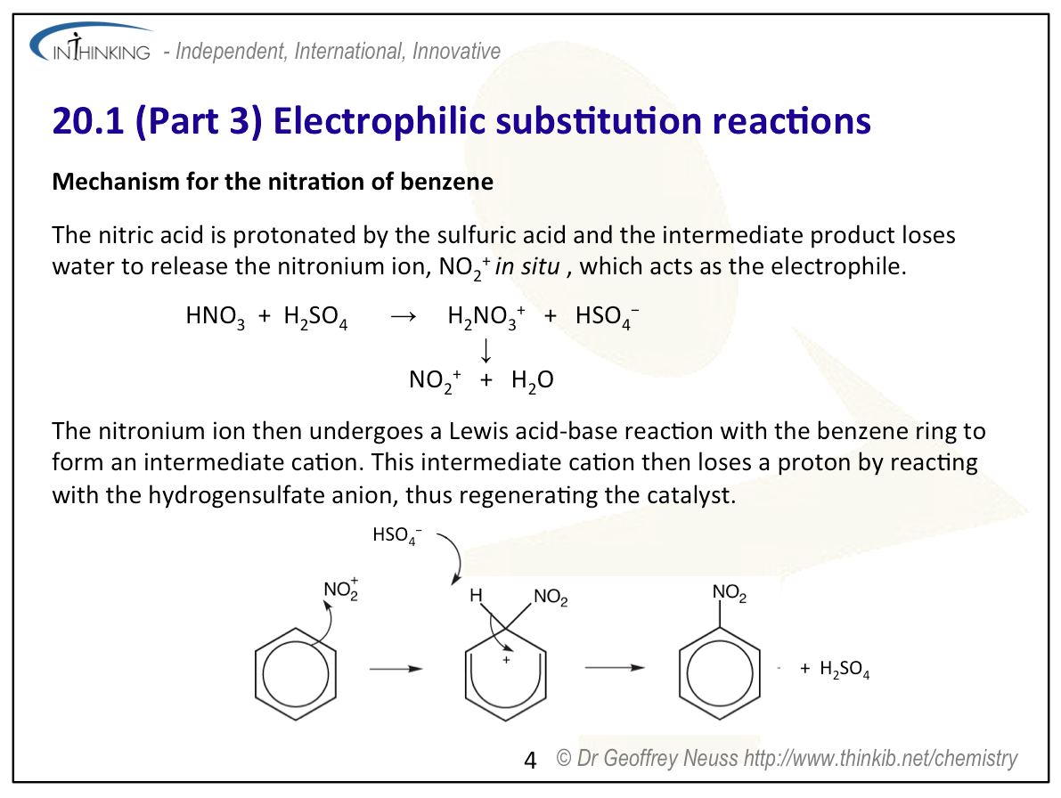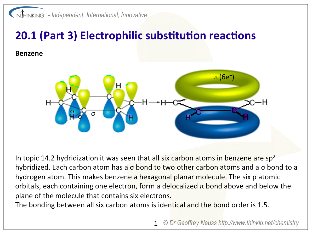 Teaching tipsThis is sub-topic contains a lot of good chemistry. If you approach it logically then there is no reason why students should find it difficult. They cannot just rely on memory though but need to understand fully the underlying mechanism. The key to understanding is the sp2 hybridization of each carbon atom. This results in a hexagonal planar molecule where each carbon atom is bonded by sigma bonds to two other carbon atoms and one hydrogen atom together with a delocalized pi bond over all six carbon atoms giving equal C to C bond lengths with a bond order of 1.5. It is easy to see that the volume of electron density above and below the ring will attract electrophiles. It is also easy to explain that substitution rather than addition will occur because the delocalization energy provides extra stability to the ring which does not need to be overcome during substitution reactions. When explaining the nitration of benzene you will need to explain the function of the sulfuric acid (to produce the nitronium ion electrophile, NO2+). Although probably not on the syllabus it is probably worth pointing out that it is exactly the same mechanism for other electrophilic substitution reactions except that now it is the halogen carrier which is needed to produce the electrophile. Stress the importance of the intermediate carbocation and look at the answers to the attached questions to see how the IB requires students to set out this mechanism in the exam to gain full marks. The syllabus now seems to be limited just to benzene so there is no need to go into the directing effects of substituents such as -CH3, -OH or -NO2. However, due to its carcinogenic properties, benzene is banned in school laboratories so the only way students can get 'hands on' experience of the required mechanism is to nitrate nitrobenzene. This is a traditional experiment and well worth doing for all the manipulative techniques it involves. | Study guide